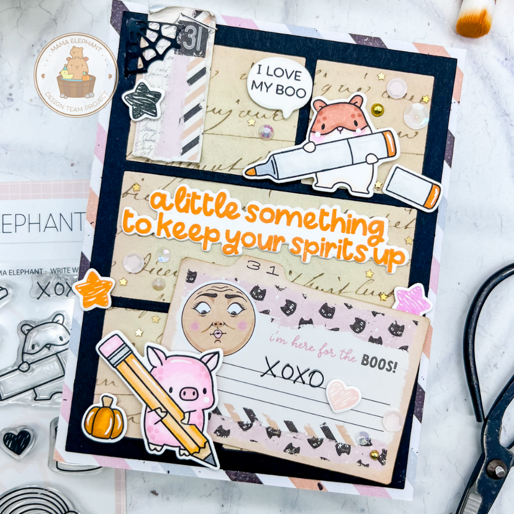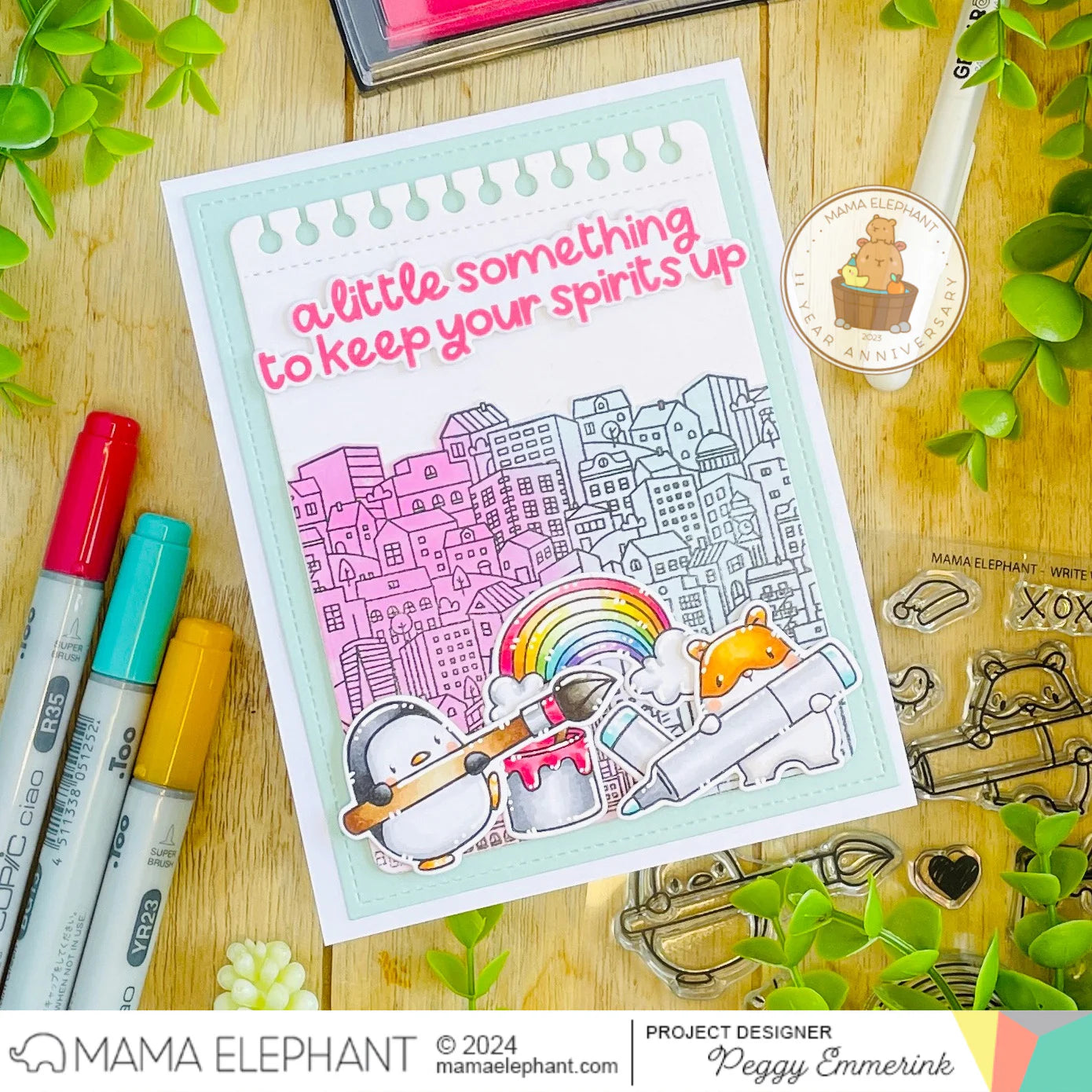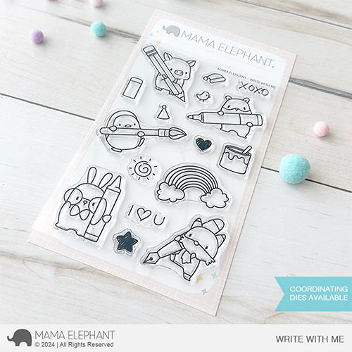 The Mama Elephant Write With Me Clear Stamps set is a delightful addition to your crafting collection, featuring 16 charming image stamps. This set showcases adorable critters with oversized writing instruments and accessories, including a pig, penguin, hamster, fox, and rabbit, all ready to make their mark!
