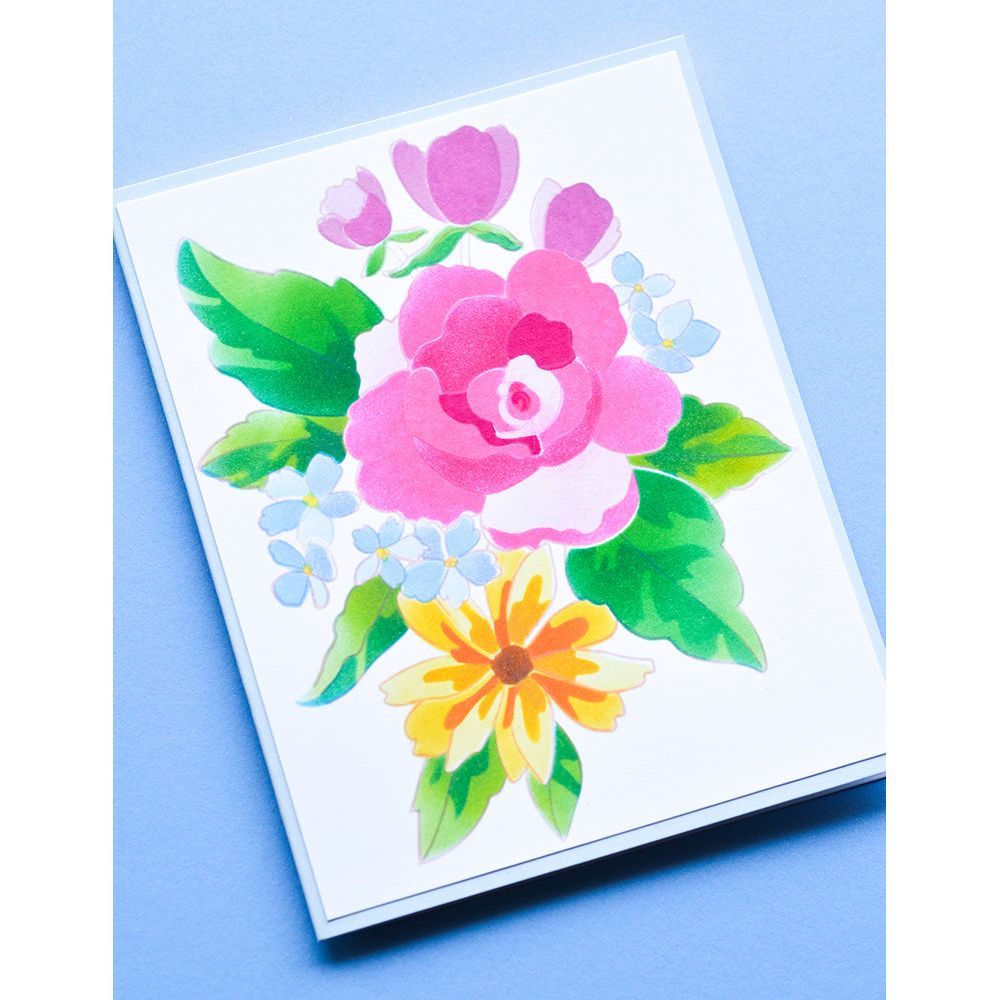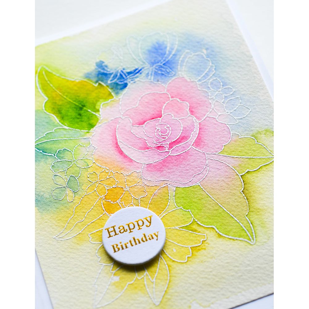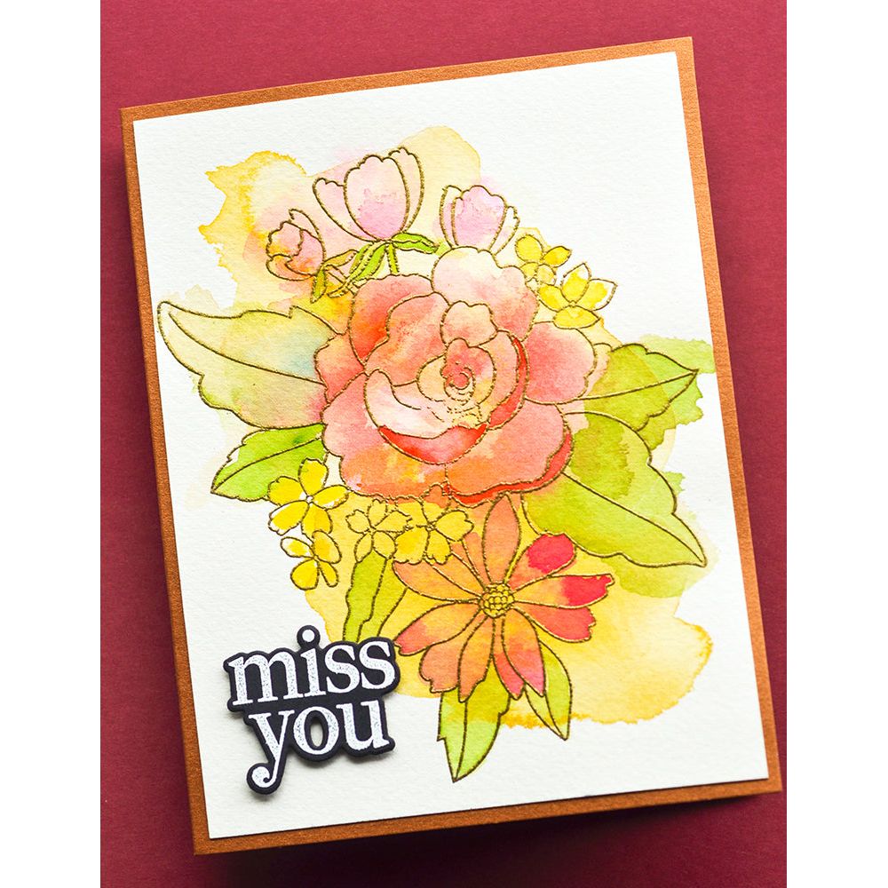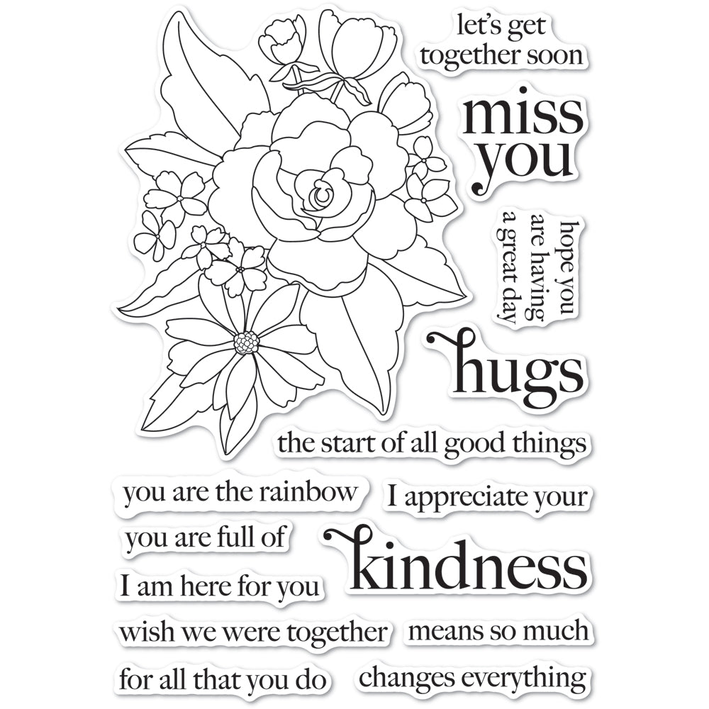 Memory Box Cheerful Floral Clear Stamp Set is a 6 x 8 inch clear stamp set made of elastopolymer. This set includes a total of 15 stamps, perfect for adding delightful touches to your projects. The focal point of the stamp set is a beautiful floral bouquet accompanied by leaves, providing a charming centerpiece for your creations. Alongside the floral image, the set offers 14 sentiments that convey various messages and emotions, such as "let’s get together soon," "hope you are having a great day," and "you are the rainbow." Additionally, the set includes three large words—Kindness, miss you, and hugs—that coordinate with the sentiments, allowing for endless creative possibilities in expressing gratitude, affection, and positivity.