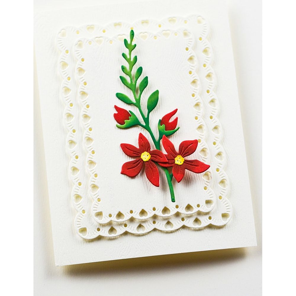 The Memory Box Cherish Scalloped Frames Dies, part of the Peony Collection, are crafted from durable steel and designed to work seamlessly with most die-cutting machines. These wafer-thin dies cut effortlessly through materials like cardstock, felt, fabric, and shrink plastic, making them a great addition to your crafting supplies. This set includes six dies, detabbed and mounted on a magnetic sheet, with nesting frames that feature scalloped borders accented with hearts and lines. The frames measure approximately 4 x 5.25 inches, 3.3 x 4.7 inches, 2.6 x 4.1 inches, 2 x 3.5 inches, 1.5 x 3 inches, and 1 x 2.4 inches. Perfect for layering, framing sentiments, and adding decorative elements to cards, scrapbooks, and paper crafts.
