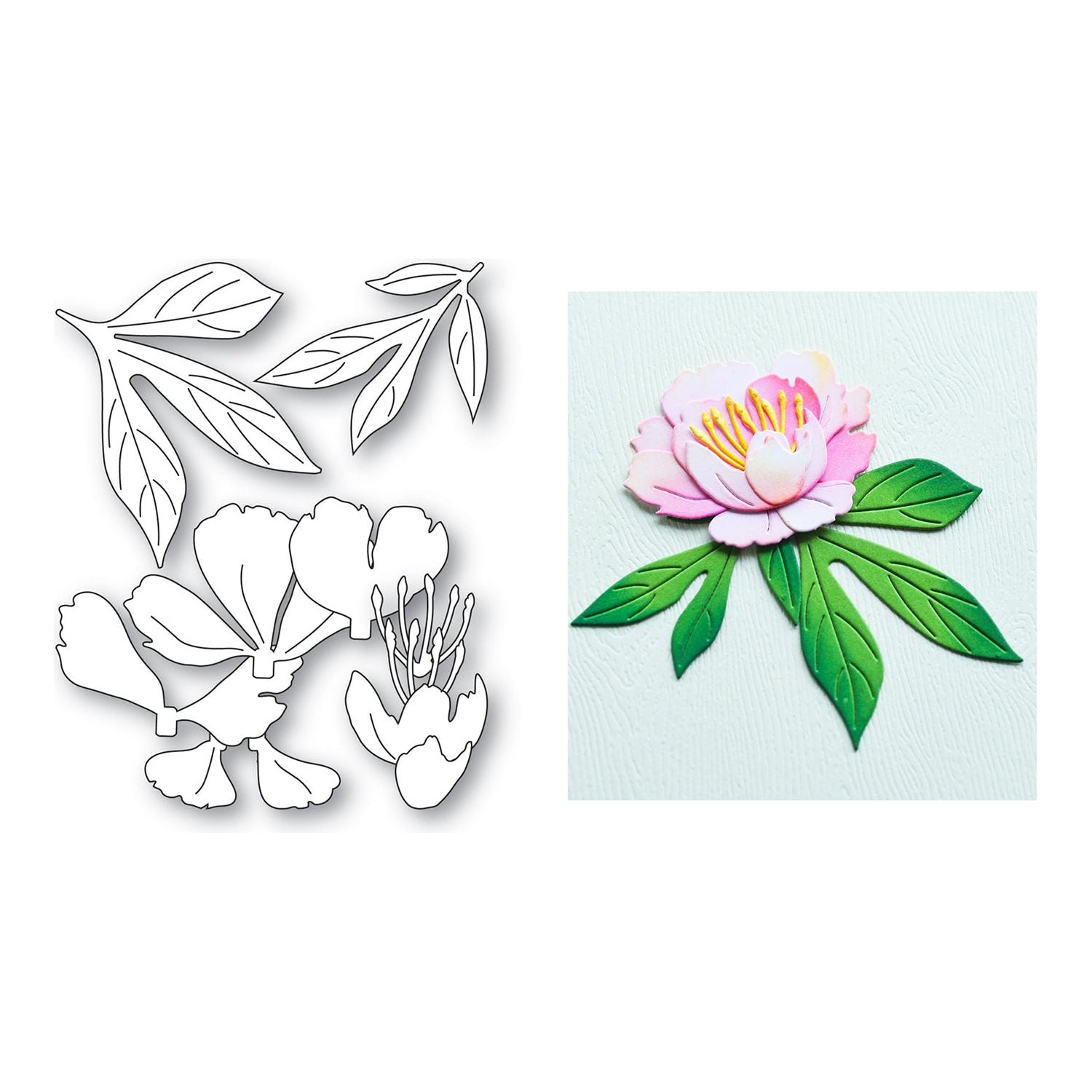 The Memory Box Gentle Peony Bloom Dies, part of the Peony Collection, are crafted from durable steel and designed for seamless use with most die-cutting machines. These wafer-thin dies cut effortlessly through materials like cardstock, felt, fabric, and shrink plastic, making them a versatile addition to your crafting supplies. This set includes three dies, detabbed and mounted on a magnetic sheet, that cut 11 individual elements. The assembled peony measures approximately 2 x 1.5 inches, with leaves measuring 1.7 x 1.4 inches and 1.9 x 2.2 inches. Create a beautifully layered bloom by assembling petals, leaves, and a detailed stamen. Perfect for floral arrangements, cardmaking, scrapbooking, and elegant botanical designs.