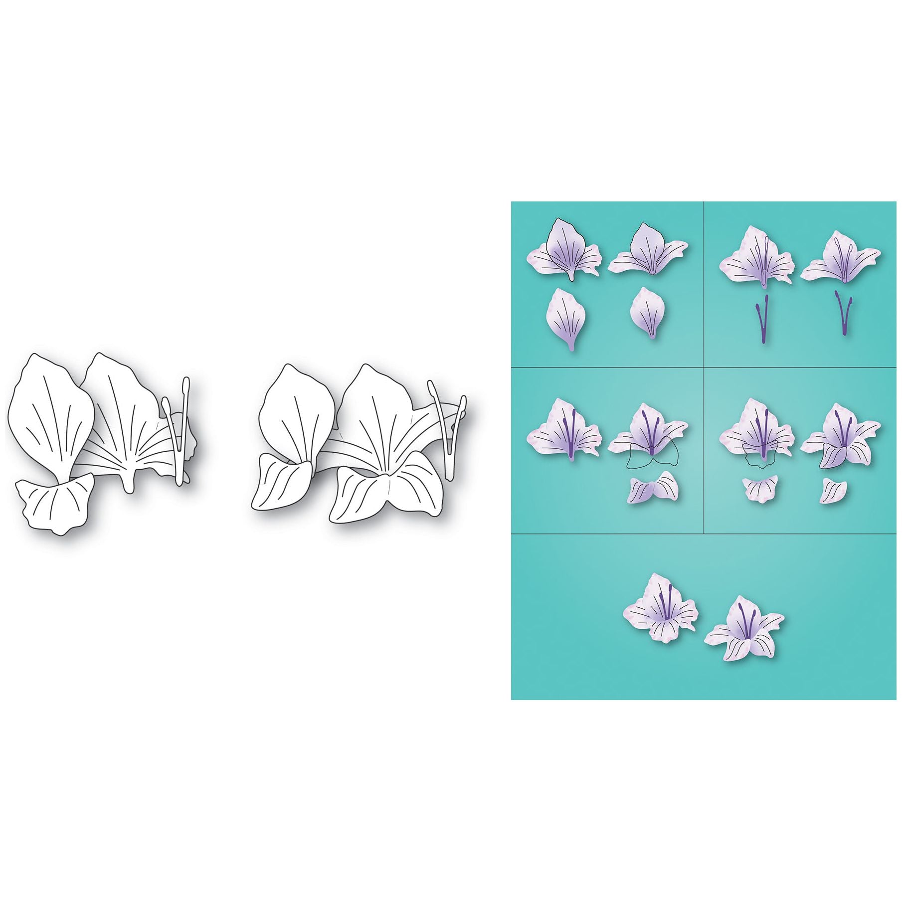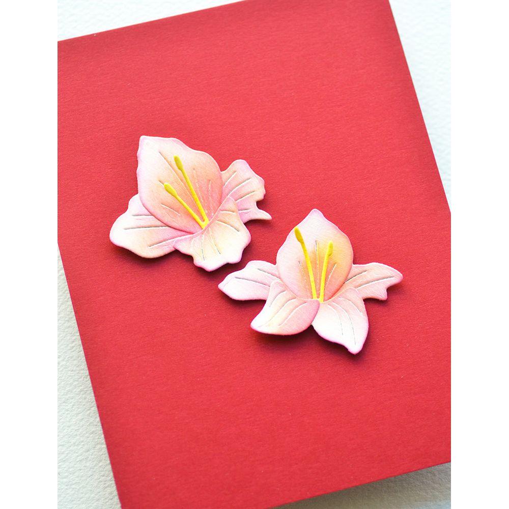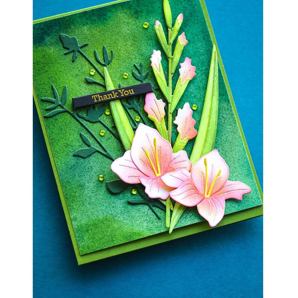 Memory Box Gladiola Floral Duo Dies are made of durable steel and usable in nearly every machine on the market! Use on cardstock, felt, fabric or shrink plastic. Cut, stencil, emboss and create! The set includes 1 wafer-thin die that cuts out 9 intricate designs, with the assembled blooms measuring approximately 1.8 x 1.7 inches and 1.9 x 1.6 inches. With these dies, you can create two gladiolus blooms, complete with embossed veins, petals, and stamen, adding lifelike detail to your projects. These dies coordinate perfectly with other Memory Box gladiola-themed dies, including Sensational Gladiola Stem, Whimsical Gladiola, Fanciful Gladiola Stem, Budding Gladiola Stem, and Gladiola Blossom and Leaves.