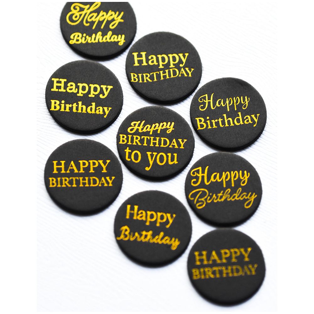 Memory Box Happy Birthday Foil Greetings Black Circle Tabs provide 36 white greeting tabs, each featuring gold-foiled "Happy Birthday" text in 10 different fonts. This pack includes 4 of each of the 9 unique designs. Each tab has an approximately 1-inch radius circle.