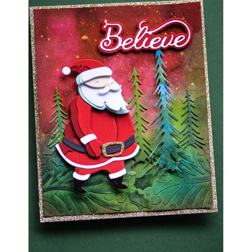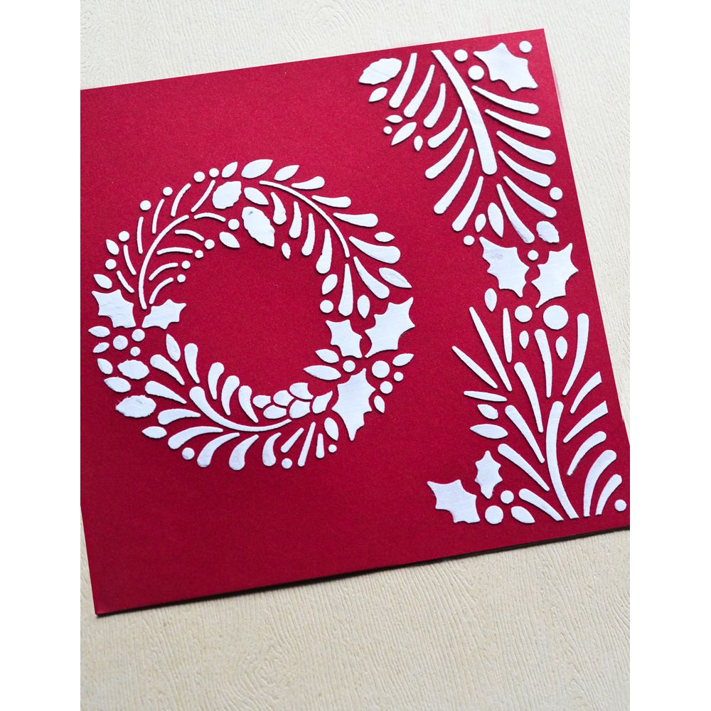 The Memory Box Holly Wreath Stencil, part of the Yuletide Collection, measures approximately 6 x 6 inches. This stencil showcases a beautifully detailed wreath composed of greenery, holly leaves, and berries, surrounded by a border of pine sprigs. It's ideal for adding a festive and traditional holiday motif to your crafting projects, whether you're creating cards, decorations, or other seasonal designs.