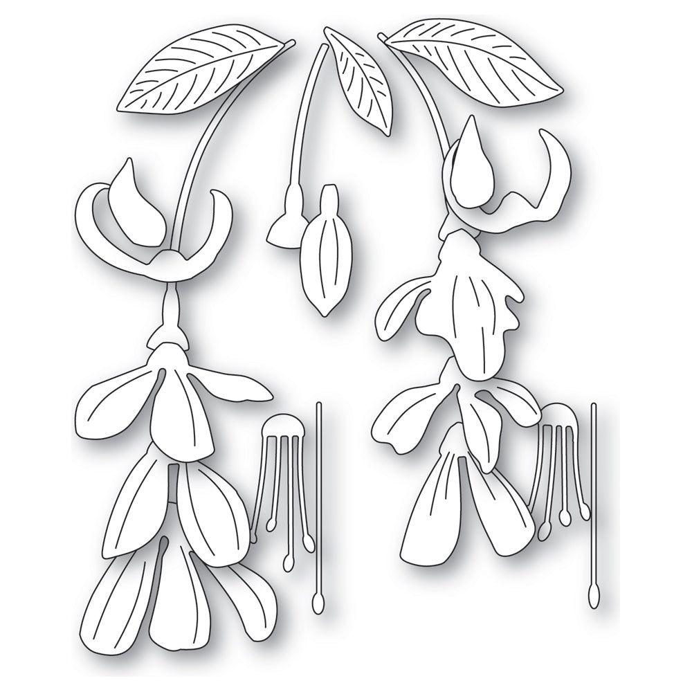 The Memory Box Lavish Fuchsia Stem Dies are made from durable steel and compatible with most die-cutting machines on the market. You can use these dies on various materials, including cardstock, felt, fabric, or shrink plastic. They offer the flexibility to cut, stencil, emboss, and unleash creativity. This set includes one wafer-thin die that cuts out 21 designs, allowing you to fashion a leafy stem adorned with two blooming fuchsia flowers and one bud hanging elegantly. The assembled dimensions of the fuchsias are approximately 0.5 x 2.1 inches, 1.7 x 4.4 inches, and 1.3 x 3.6 inches, while the leaves measure approximately 1.3 x 0.7 inches, 1.4 x 0.7 inches, and 0.5 x 0.9 inch. Works well with Hardy Fuchsia Buds Dies 94783, Delicate Fuchsia Trio Dies 94784, Fuchsia Bud Duo Dies 94786, Dainty Fuchsia Stem Dies 94787 and Little Fuchsia Flower Trio and Branch Dies 94788.