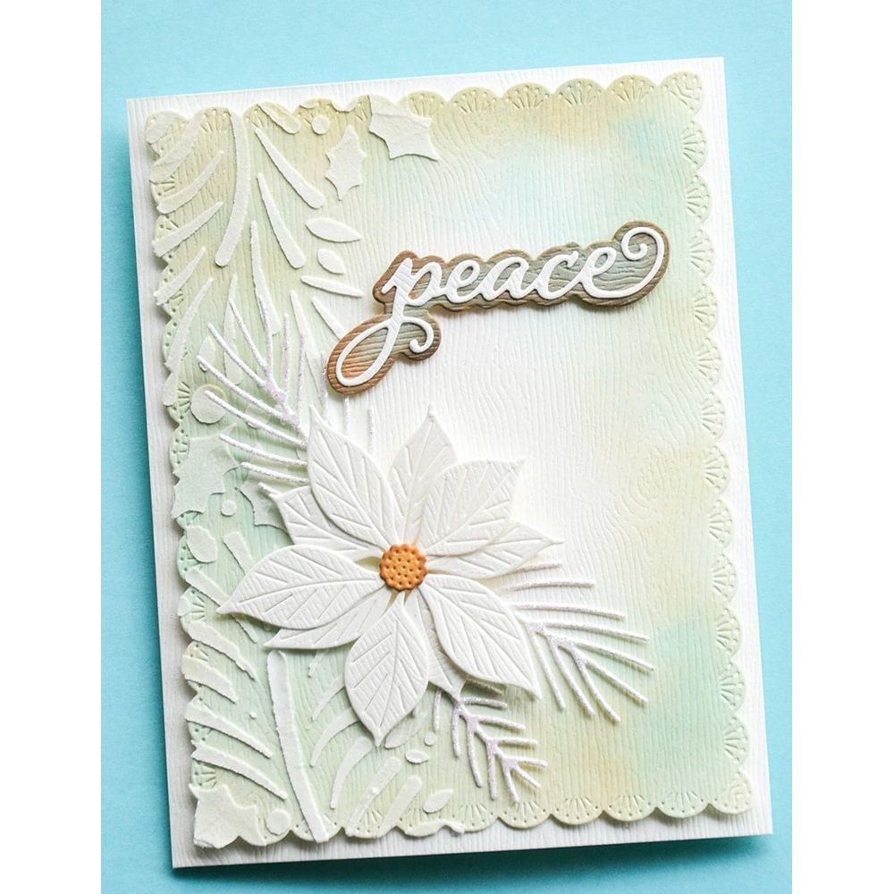 Memory Box Peace Love Joy Stylish Script Dies, part of the Joyful Season Collection, are crafted from durable steel and compatible with most die-cutting machines. These wafer-thin dies cut cleanly through cardstock, felt, fabric, and shrink plastic. The set includes 6 detabbed dies mounted on a magnetic sheet. “Peace” and “love” are in elegant script fonts, while “joy” is in a simple lowercase font, each with a coordinating shadow layer for added dimension. Approximate sizes: love 1.3 x 0.7 inches, outer 1.4 x 0.8 inches; peace 2.4 x 0.9 inches, outer 2.5 x 1.1 inches; joy 1 x 0.7 inches, outer 1.1 x 0.8 inches.