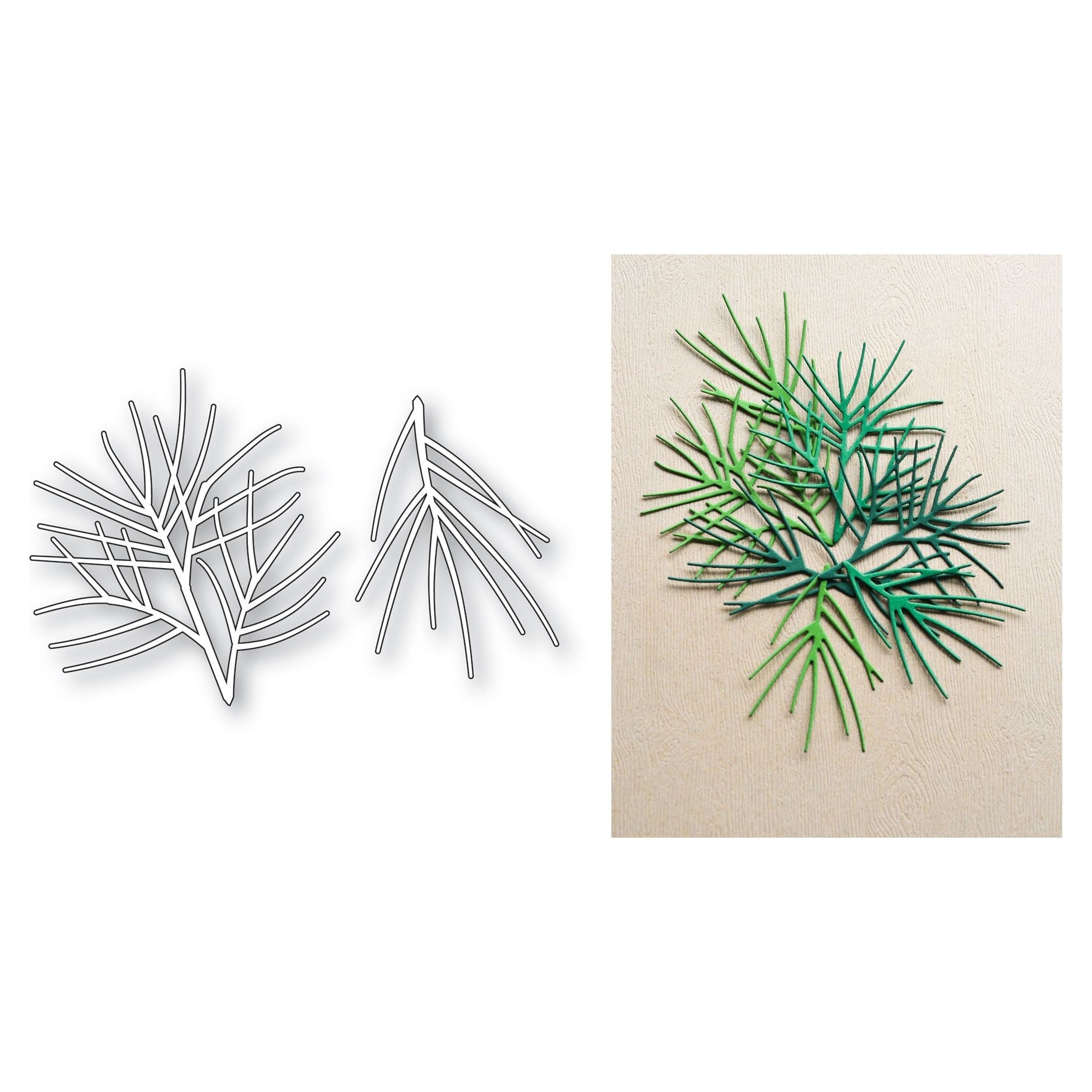 Memory Box Pine Branches Dies are made from durable steel and compatible with most die-cutting machines. You can use these dies on various materials, including cardstock, felt, fabric, or shrink plastic. They offer the flexibility to cut, stencil, emboss, and unleash creativity. Part of the Yuletide Collection, this set includes one wafer-thin die that cuts out two designs. The designs measure approximately 1.6 x 2.2 inches and 2.4 x 2.7 inches. Use these dies to create detailed sprigs of pine, perfect for adding a festive touch to your projects.