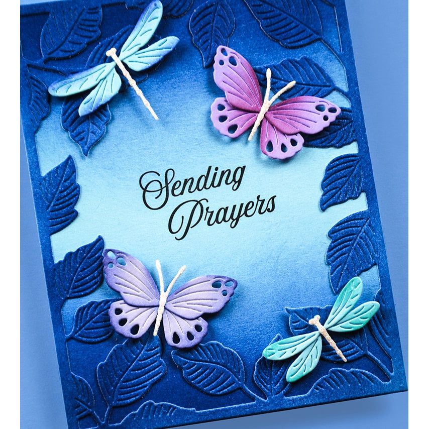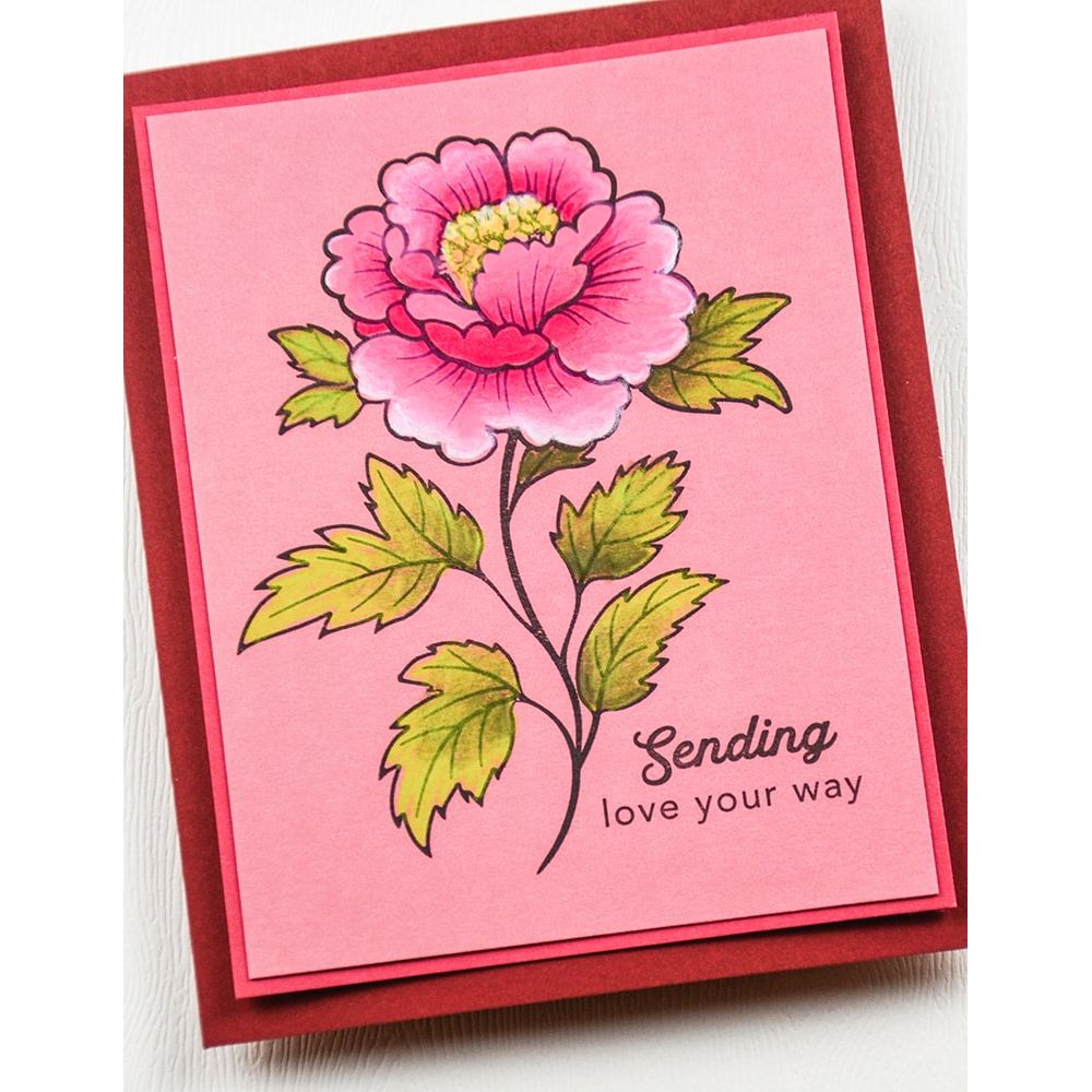 Memory Box With Sympathy Clear Stamp set, part of the Summer Meadow Collection, is a 4 x 6-inch elastopolymer clear stamp set featuring 7 high-quality pieces. It includes a large, leafy, stemmed flower and six heartfelt sentiments: "Sending my love," "With Love," "With Sympathy," "You are in my thoughts," "I’m here if you need me," and "Sending Prayers."