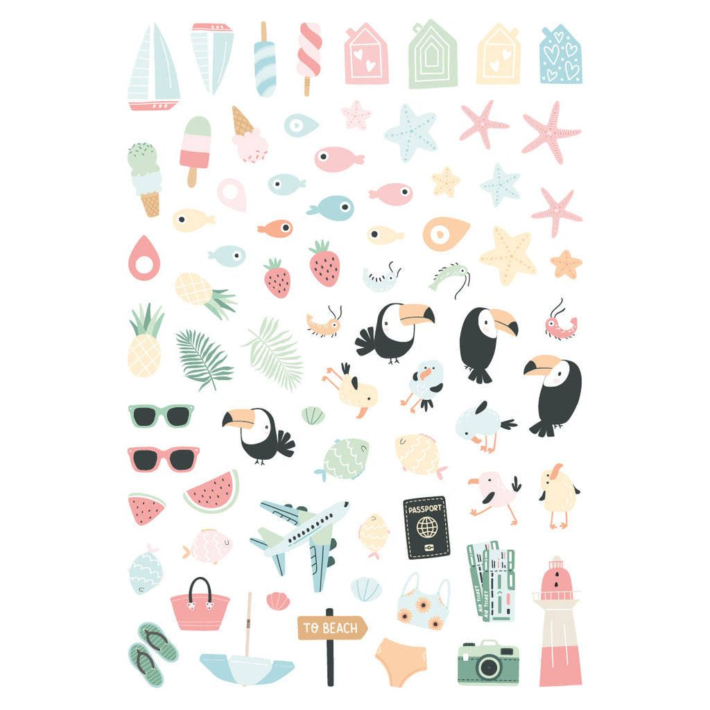 ModaScrap Tropical Dream die cuts are perfect for embellishing cards, tags, planners, and various projects. The pack includes 74 die cuts that coordinate with the Tropical Dream collection. Ephemera include sailboats, sunglasses, watermelon, fish, starfish, a plane, a lighthouse, a bikini, a camera, flip flops, fronds, birds, popsicles, ice cream, beach huts, and more. These die cuts are perfect for adding a fun and vibrant touch to your summer-themed creations.