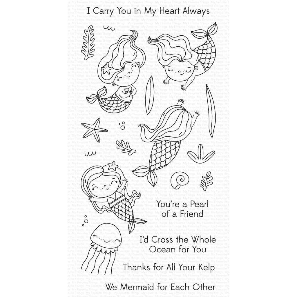 My Favorite Things Mermaid for Each Other Clear Stamps features a 4x8 inch clear stamp set with 22 pieces, including 4 unique mermaids, a squid, starfish, shell, seaweed, bubbles, and waves. Perfect for crafting projects, this set is a great way to add a touch of underwater charm to your creations.