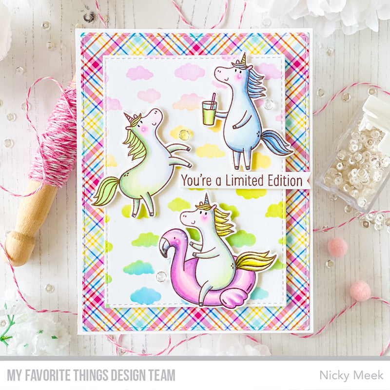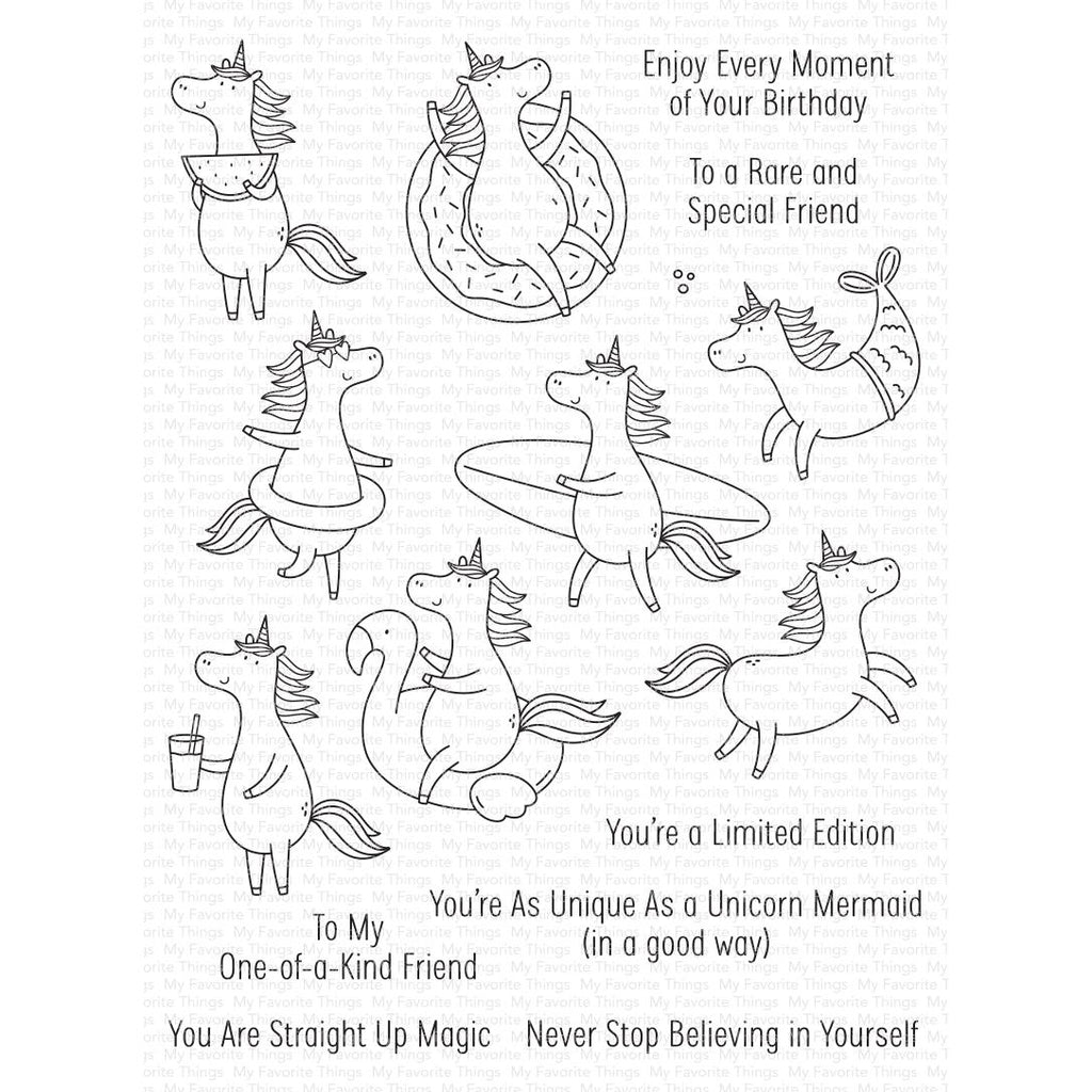 My Favorite Things One-of-a-Kind Friend Clear Stamp set offers 16 unique pieces to personalize your projects: a watermelon unicorn, a doughnut floatie unicorn, a sunglasses unicorn, a surfboard unicorn, a mermaid unicorn, a drink unicorn, a flamingo floatie unicorn, a leaping unicorn, and bubbles accent. The entire stamp set measures 6x8 inches. Make your cards unique with this one-of-a-kind selection.