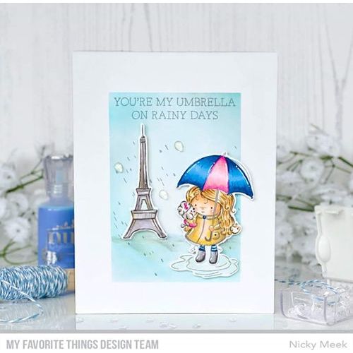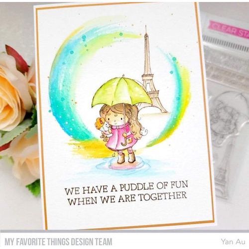 Springtime in Paris…what could be better? This little charmer is April-shower-ready in a slicker, rain boots, and umbrella with that cute little poodle needs shelter from the storm as well! Set the scene with the iconic tower image in the background and then layer the raindrops and puddle to create a soft spring storm. This 4x6 inch clear stamp set contains 7 unique stamps including the following sentiments: Even When It’s Raining, You Make Me Feel Sunny Inside, We Have a Puddle of Fun When We Are Together, You’re My Umbrella on Rainy Days.