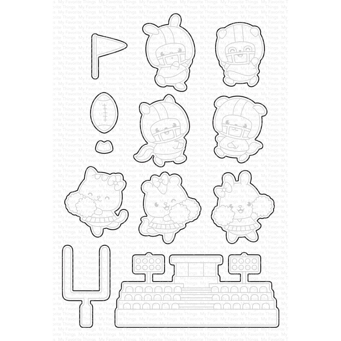 My Favorite Things Touchdown! Dies Die-Namics is perfect for combining your stamping and die cutting. This set of dies can be used to pre-cut your image before stamping or to add detail and dimension to stamped images. The open inner cutting areas make for easy removal and the 12 piece set ensures great versatility.
