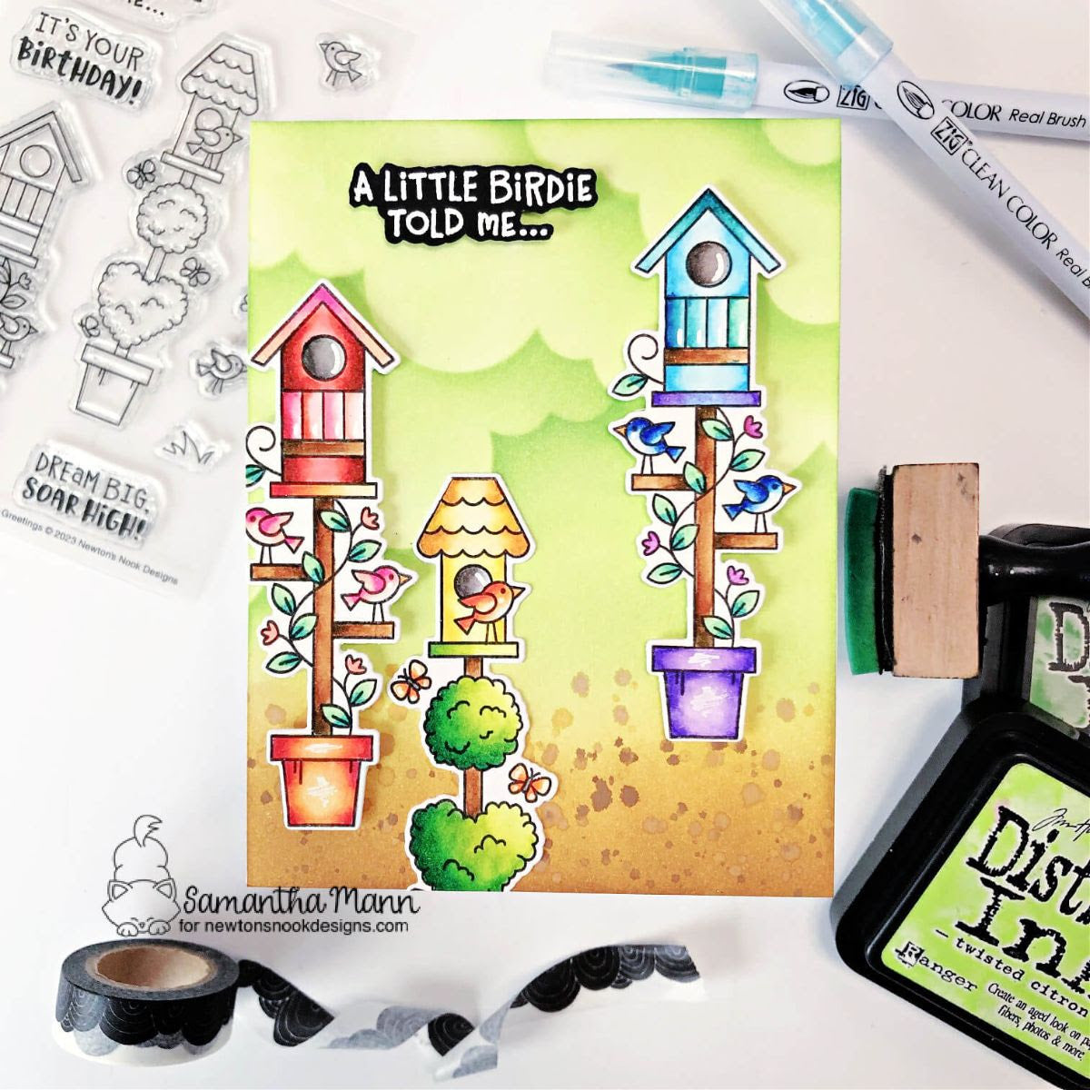 Introducing the Newton's Nook Birdhouse Greetings Clear Stamps! This charming set is accompanied by the coordinating Birdhouse Greetings Die Set. The delightful birdhouses featured in this 4x6 stamp set are perfect for conveying spring birthday wishes. With two adorable birdhouse designs to choose from, it will be difficult to pick a favorite. Furthermore, both designs fit perfectly on the bookmark from our Bookmark Die Set, allowing you to create bookmarks as well. The set includes additional bird and butterfly images to enhance your scenes, along with sentiments for birthday greetings and inspirational wishes.