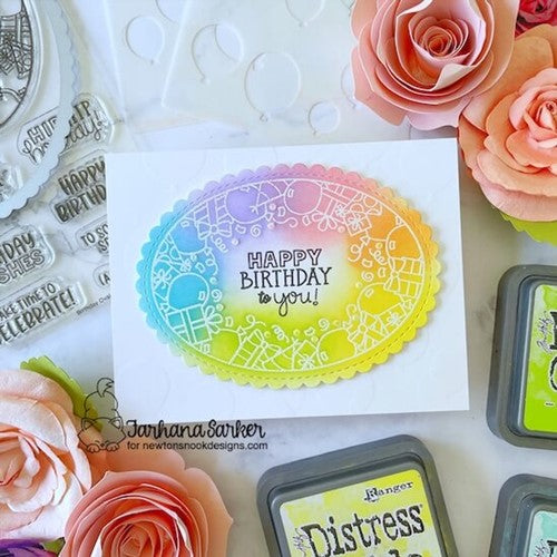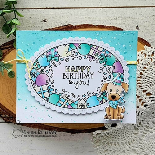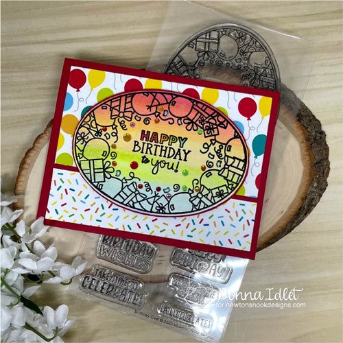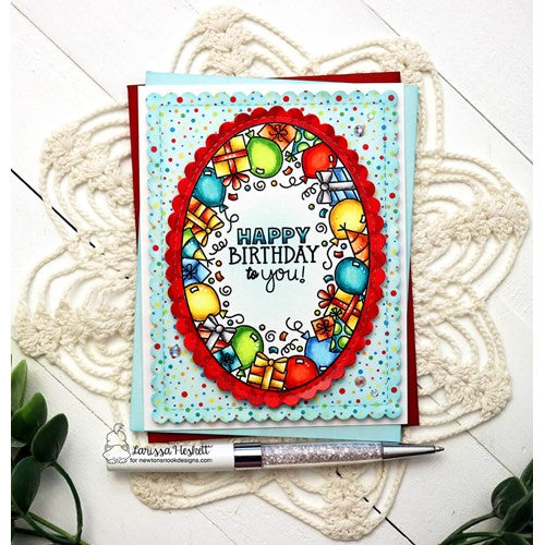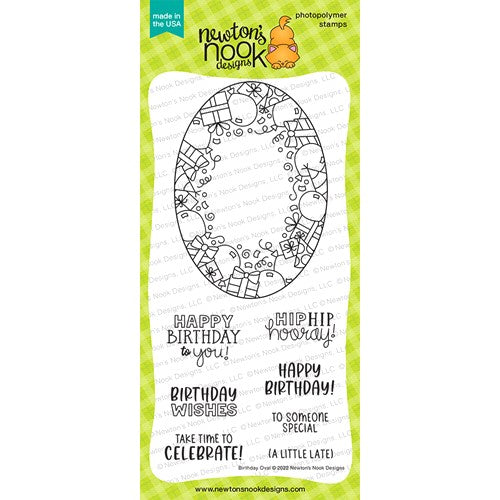 Celebrate a special birthday with this 4x8 inch stamp set. This delightful design features one large oval frame with balloons, presents, party hats and confetti around the edge. Each of the sentiments will fit inside the frame for vertical or horizontal layouts. There is even a sentiment for sending belated wishes. The large oval image is sized to fit inside the scallop edged frame on the Oval Frames Die Set and will fit on the front of a standard A2 sized card.