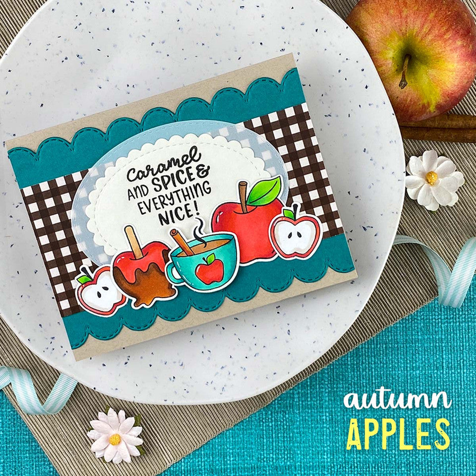 Introducing the Newton's Nook Autumn Apples Stamp Set. The allure of autumn shines through in this delectable 4x6 inch stamp collection. The charm of apples combined with the warmth of spices takes center stage. The assemblage features depictions of apples, apple cider, and the enticing caramel apple. Complementing sentiments are included, aptly capturing the essence of snug fall days. This set also proves ideal for crafting school-related or teacher appreciation cards.