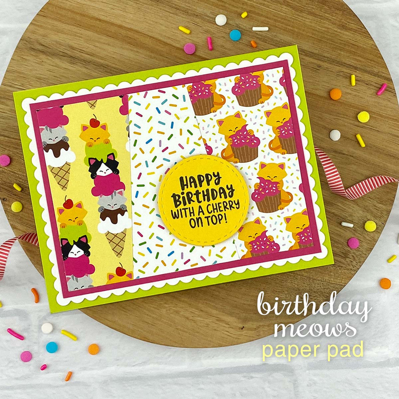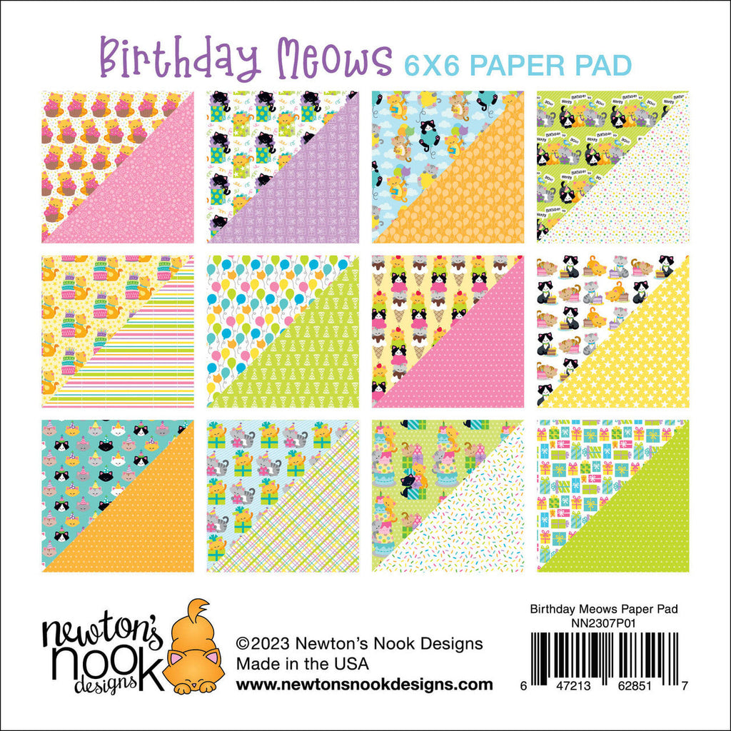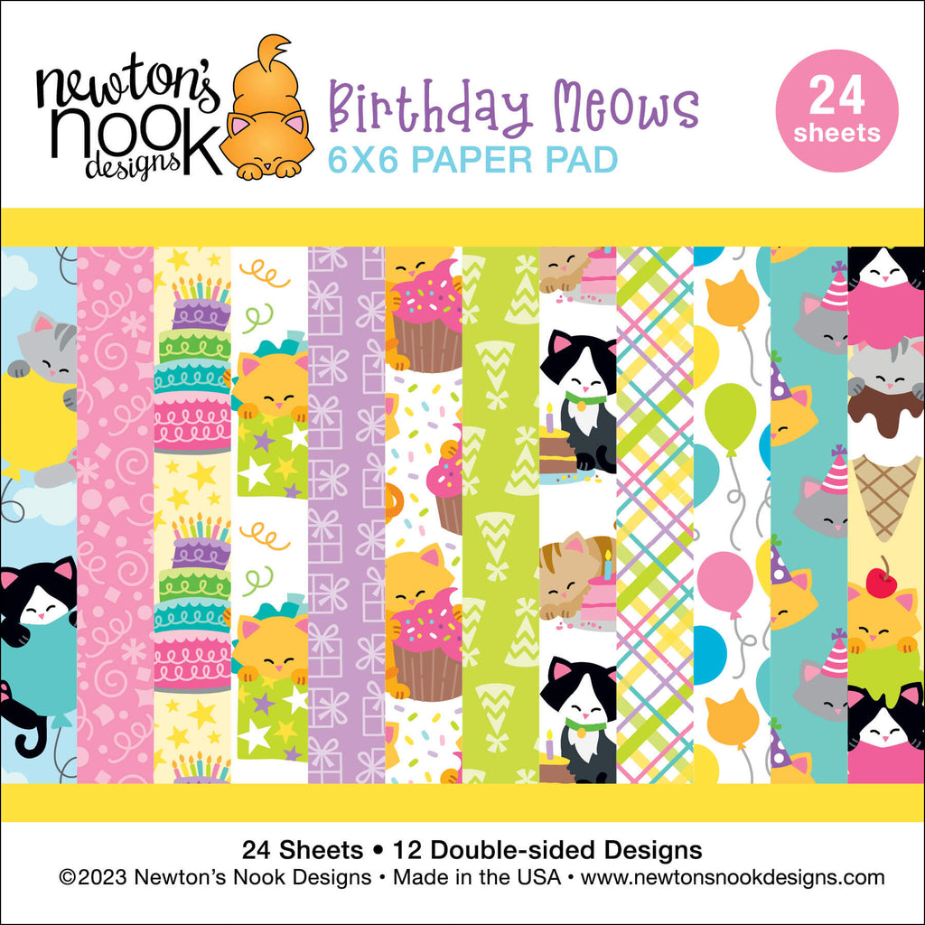 The Newton's Nook Designs Birthday Meows 6x6 inch Paper Pad invites you to celebrate birthdays alongside Newton and his kitty friends. This delightful paper pad features 24 sheets, with 2 of each of the 12 different double-sided designs. Printed on heavy cardstock with a touch of sheen, these papers offer both durability and a subtle shimmer. Many of the designs showcase adorable kitties adorned with birthday hats, balloons, cakes, and more, adding a charming touch to your birthday-themed projects.