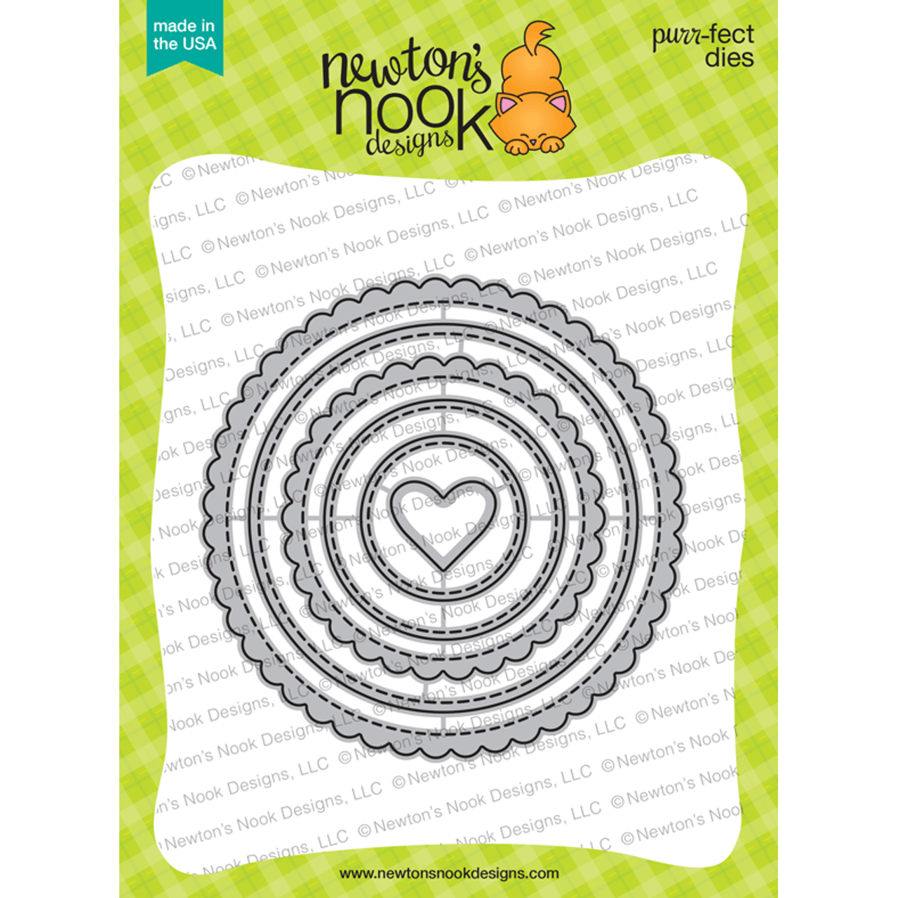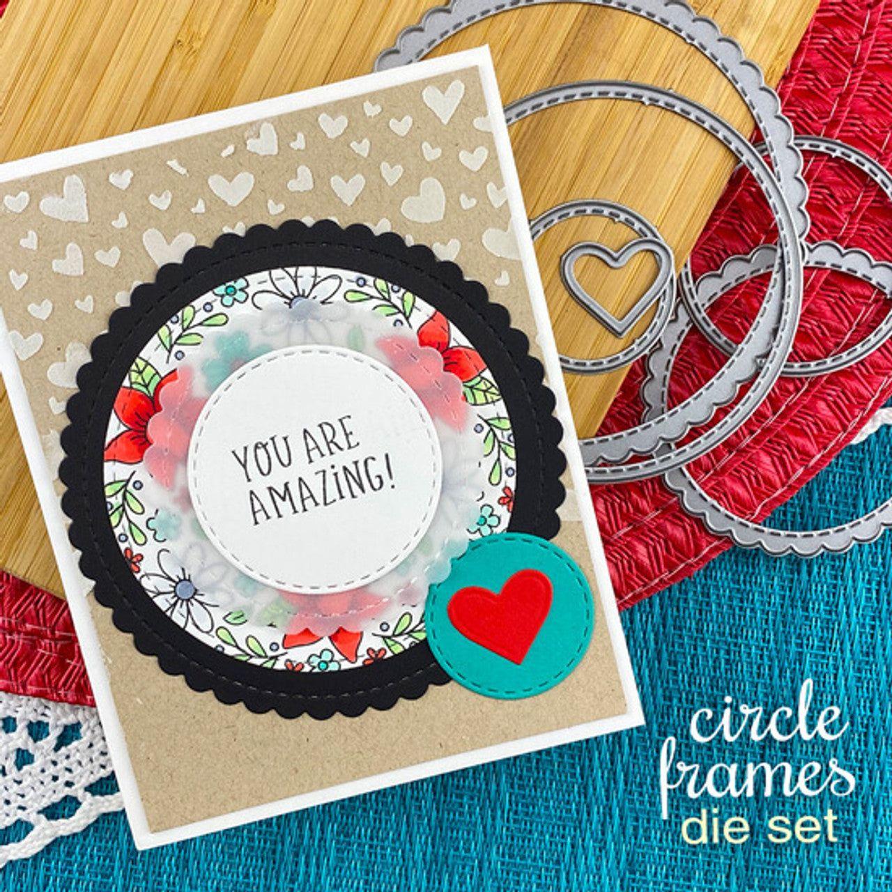 This set of dies includes decorative circles with stitching and scallops that are perfect for making circle cards or adding circles to any card. All the circles will fit on a standard A4 sized card or can be layered on square cards too. Mix and match these fun shapes for endless possibilities! This set also includes a small heart die.