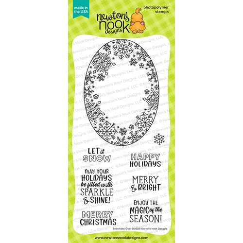 Send flurries of magical Holiday greetings with this 4x8 inch stamp set. This beautiful design features one large oval frame with snowflakes all along the edges. Each of the sentiments will fit inside the frame for vertical or horizontal layouts. There is even an extra snowflake that you can add to the inside or use to create background patterns with. The large oval image is sized to fit inside the scallop edged frame on the Oval Frames Die Set and will fit on the front of a standard A2 sized card.