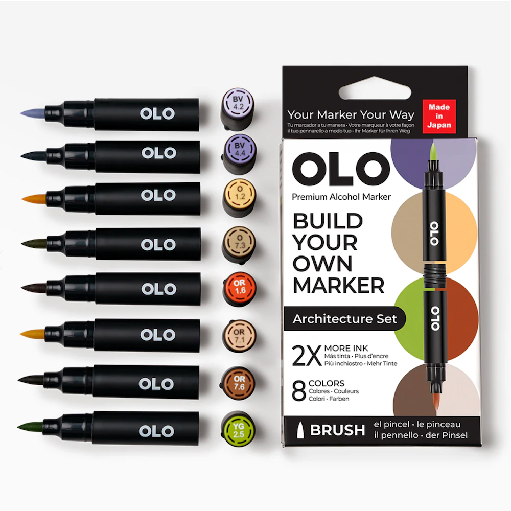 The OLO Architecture Brush 8 Piece Marker Set includes a refined palette ideal for architectural sketches, structural illustrations, and design work. This curated set features 8 alcohol-based brush nib markers selected to capture urban scenes, floor plans, and technical details with precision and style.
