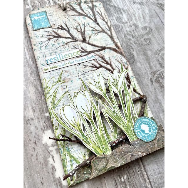 The Paper Artsy Crocus Edition Cling Stamps, designed by Alison Bomber as part of the Eclectica3 collection, is a 6x8-inch stamp set featuring 11 beautifully detailed stamps. Each stamp is individually cut on EZ mount, allowing for easy peeling and positioning on an acrylic block for immediate use. The set includes crocus blooms, long leaves, roots, a foreign postage stamp, a vintage three-pound coin, and a lowercase alphabet. Sentiments include the words "roots," "promise," and "resilience," along with the phrases "the hidden life that breaks forth" and "a light exists in Spring." Perfect for mixed media, journaling, and botanical-themed projects, this collection captures the beauty and symbolism of nature.