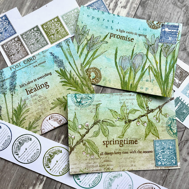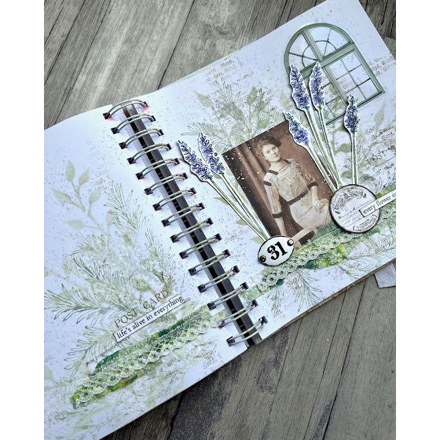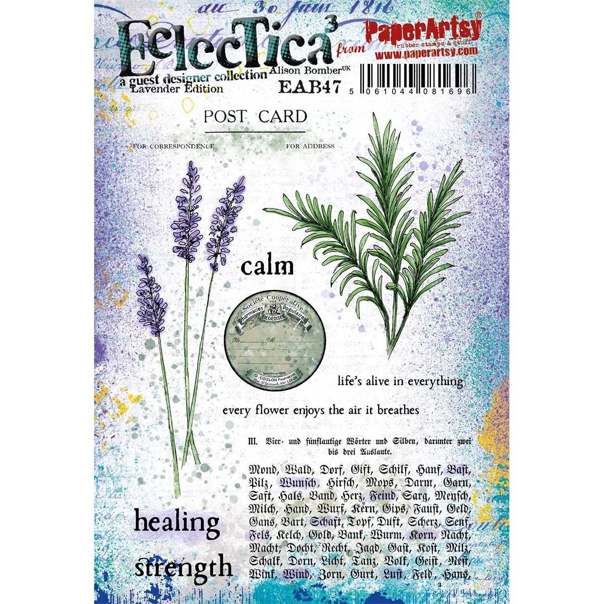 The Paper Artsy Lavender Edition Cling Stamps, designed by Alison Bomber as part of the Eclectica3 collection, is a 6x8-inch stamp set featuring 11 beautifully detailed stamps. Each stamp is individually cut on EZ mount, allowing for easy peeling and positioning on an acrylic block for immediate use. The set includes a round seal for a French Pharmacy Society, delicate lavender blooms, stalks of leaves, and an excerpt of text in German. Additional elements include a "POST CARD" stamp with "For correspondence" and "For address" underneath, the words "calm," "healing," and "strength," along with the phrases "life’s alive in everything" and "every flower enjoys the air it breathes." Perfect for mixed media, journaling, and botanical-themed projects, this collection captures the soothing essence of lavender.