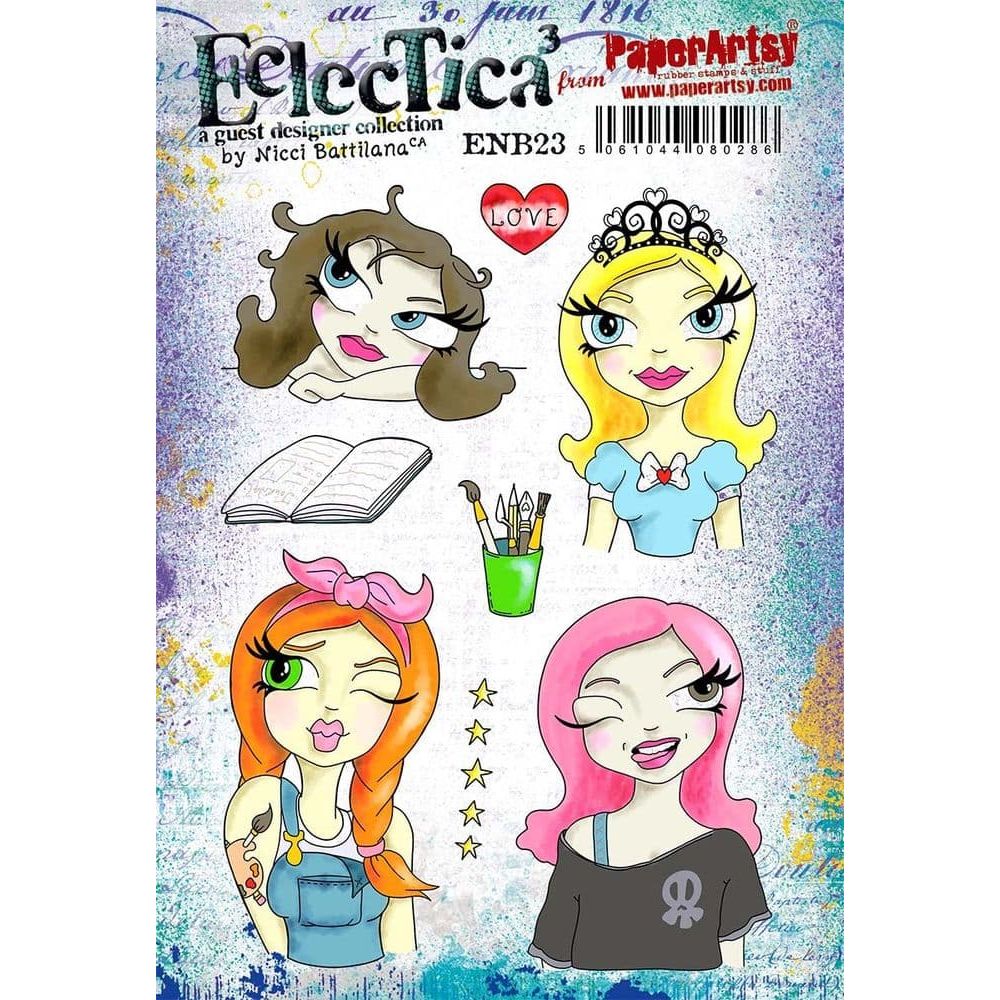 This stamp set, designed by Nicci Battilana, a Paper Artsy Eclectica3 designer, is from her Glitzy Gal Emojis Collection. Crafted with deeply etched red rubber, each stamp is trimmed and foam-mounted. This set comprises 8 pieces on a 6 x 8-inch sheet. The designs feature the busts of 4 different women characterized by large eyes, dramatic lashes, and flowing hair. One woman is depicted with her arm and head resting on a table, exuding a contemplative aura. Another woman wears a princess bodice adorned with a bow and a regal tiara. A third woman sports overalls, with a tattoo of a paintbrush and palette on her arm, a bandana in her hair, and a playful wink. The fourth woman, also winking, dons a shirt with a skull motif that drapes off one shoulder. Additionally, the set includes a heart embellished with the word "LOVE," an open book, a row of stars, and a cup filled with paintbrushes, palette knives, ink pens, and pencils. Stamp them lightly to change their eyes, hairstyle and even their clothes. By doing this, you can create your very own emojis or even new characters to fill your journals/scrapbooks and adorn your cards.