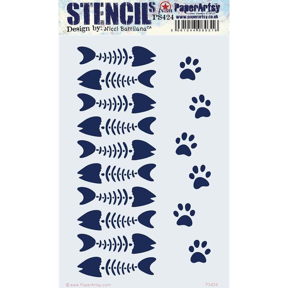 This Large Stencil, designed by Nicci Battilana, a Paper Artsy Eclectica3 designer, from her Glitzy Gal Emojis Fur-Baby Comapnions Collection. Crafted from high-quality and durable plastic, this stencil measures approximately 6.5 x 9.5 inches, ensuring its suitability for various surfaces such as paper, canvas, chipboard, and more. Its adaptable design allows for use with a wide range of mediums, including paint, Grunge Paste, paint sprays, crayons, pastels, pens, chalks, and more. The stencil features a captivating design comprising a column of 10 fishbone outlines, with every other one facing left or right, complemented by playful cat paw prints as additional elements. Whether you're creating mixed media artworks, scrapbooking, or journaling, this stencil adds an intriguing touch to your projects.