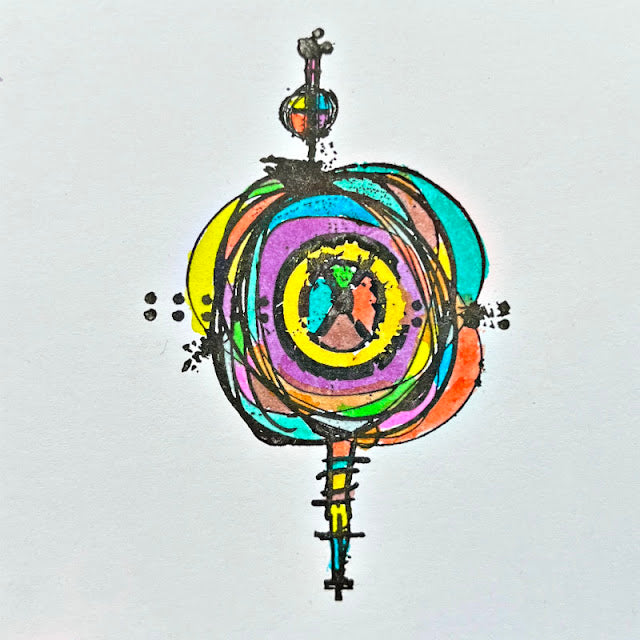 The Paper Artsy Eclectica3 Seth Apter Mini 109 Cling Stamp is a credit-card-sized rubber stamp, measuring approximately 3 x 2 inches. This particular stamp was designed by Seth Apter, a renowned artist known for his eclectic and mixed-media style. The stamp is versatile and suitable for various crafting projects, including card making, artist trading cards, inchies, and more. The stamp comes on EZ mount, which means it has a foam cushioning layer on the back. To use the stamp, peel it off the index sheet and position it onto an acrylic block. This stamp design features a scribbled circle, additional smaller circles, an "X" in the center, along with lines and polka dots.