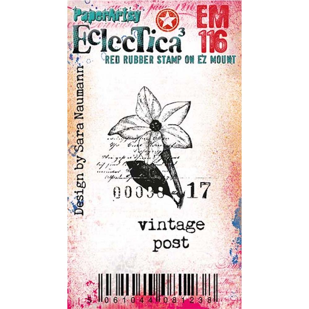 The Paper Artsy Eclectica Mini Sara Naumann Cling Stamp is a credit-card-sized rubber stamp, measuring approximately 3 x 2 inches, offering versatility for various crafting projects such as card making, artist trading cards, inchies, and more. The stamp comes mounted on EZ mount for ease of use, with a foam cushioning layer on the back. Simply peel the stamp off the index sheet and position it on an acrylic block for stamping. This particular design features a flower with a leafy stem, overlaid with script, along with the numbers "00008" and "17." The words "Vintage Post" appear underneath, perfect for adding a timeless, nostalgic touch to your projects.