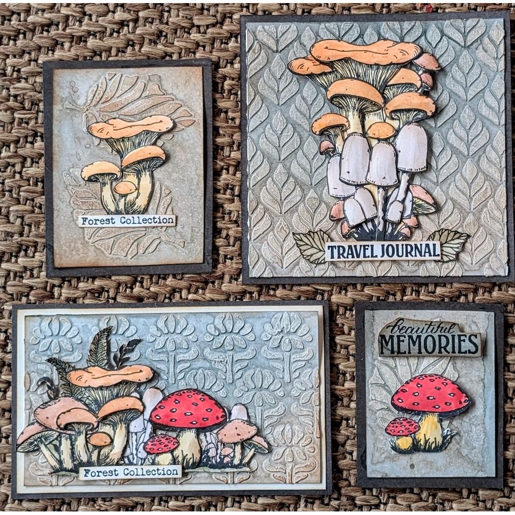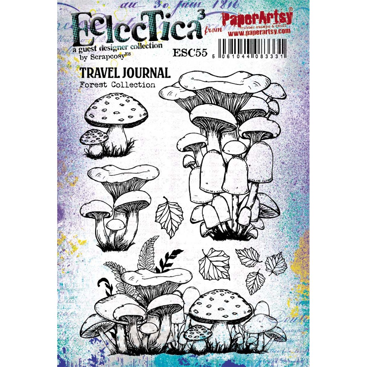 The Paper Artsy Eclectica³ Scrapcosy Cling Stamps present a charming collection designed by Raquel Burillo, also known as Scrapcosy. These versatile stamps are perfect for journaling, cardmaking, scrapbooking, and a wide range of mixed-media or altered art projects. The set includes 8 cling stamps arranged on a 6 x 8-inch sheet, featuring hand-drawn mushrooms, leaves, and other foliage, along with the sentiment “Travel Journal Forest Collection.”