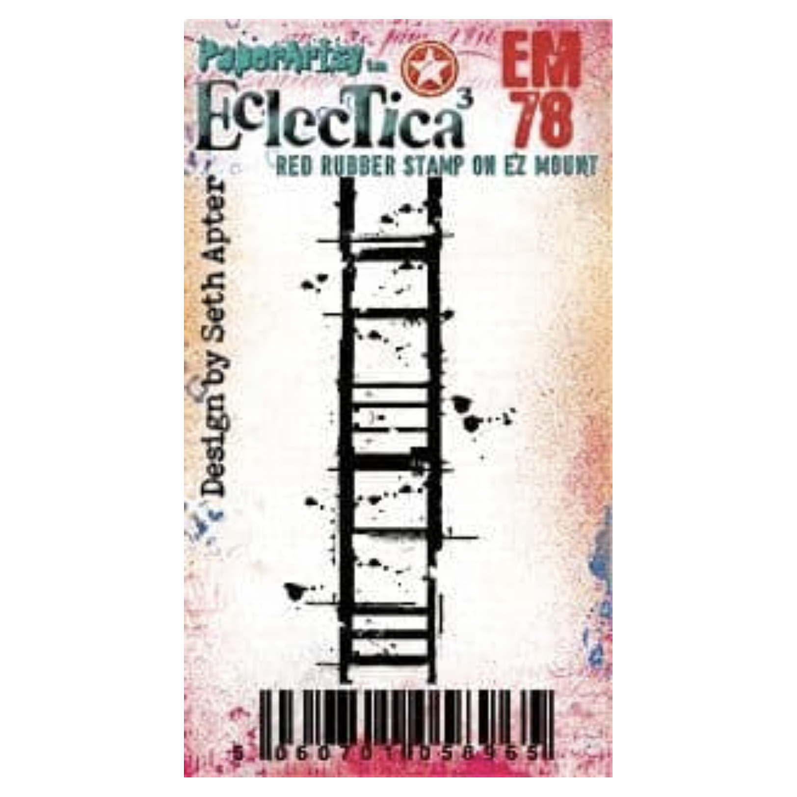 The Paper Artsy Eclectica3 Seth Apter Mini 78 Cling Stamp is a credit-card-sized rubber stamp, measuring approximately 3 x 2 inches. This particular stamp was designed by Seth Apter, a renowned artist known for his eclectic and mixed-media style. The stamp is versatile and suitable for various crafting projects, including card making, artist trading cards, inchies, and more. The stamp comes on EZ mount, which means it has a foam cushioning layer on the back. To use the stamp, peel it off the index sheet and position it onto an acrylic block. The stamp design depicts a grungy ladder that appears to be missing some rungs or resembles a faulty filmstrip. This unique and unconventional design adds a touch of artistic intrigue and texture to your projects. You can ink or paint the stamp in various colors and apply it to your crafts to create interesting backgrounds, visual layers, or focal points.
