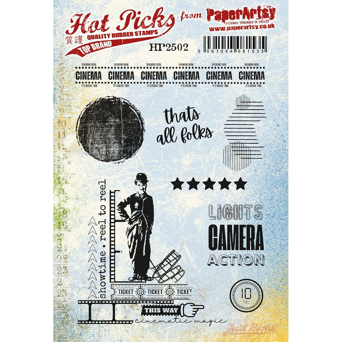 Paper Artsy Hot Pick 2502 Cling Stamps feature deeply etched red rubber for precision and durability. Each stamp is foam-mounted, ensuring crisp impressions with every use. This 6 x 8-inch cling stamp set includes 8 vintage-inspired designs by Mark Franich, celebrating classic cinema. The set features a repeating border reading "Screening now CINEMA It's movie time," a solid circle, line patterns, a "1-10 sec" timer, a row of stars, and the phrase "That's all folks." Additional designs include Charlie Chaplin surrounded by movie tickets and a film strip, a pointing hand with the words "This Way Cinematic Magic," and the phrases "Showtime" and "Reel to Reel."