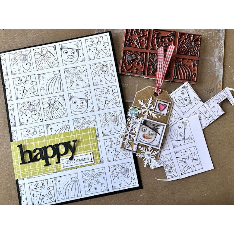 The Paper Artsy JoFY 137 Cling Stamps, designed by Jo Firth-Young, beautifully showcase her hand-drawn artistry with captivating floral motifs. Crafted from deep-etched red rubber, these stamps are precision-trimmed and foam-mounted for ease of use. This collection comprises 6 cling stamps on a 6 x 8-inch sheet. The designs feature a grid of 6 boxes, each with different holiday imagery such as the face of a snowman, a gift, a star, ornaments, a snowflake, and a bauble. Additional designs include a row of stars and hearts, a row of whimsical skinny pine trees, a blank label, the words "50% ho ho ho! 50% bah, humbug," and the phrases "Season’s greetings" and "from our house to yours." These stamps pair perfectly with JoFY Stencil PS439 for coloring in the trees and square backgrounds, making them ideal for adding a creative touch to your holiday projects.