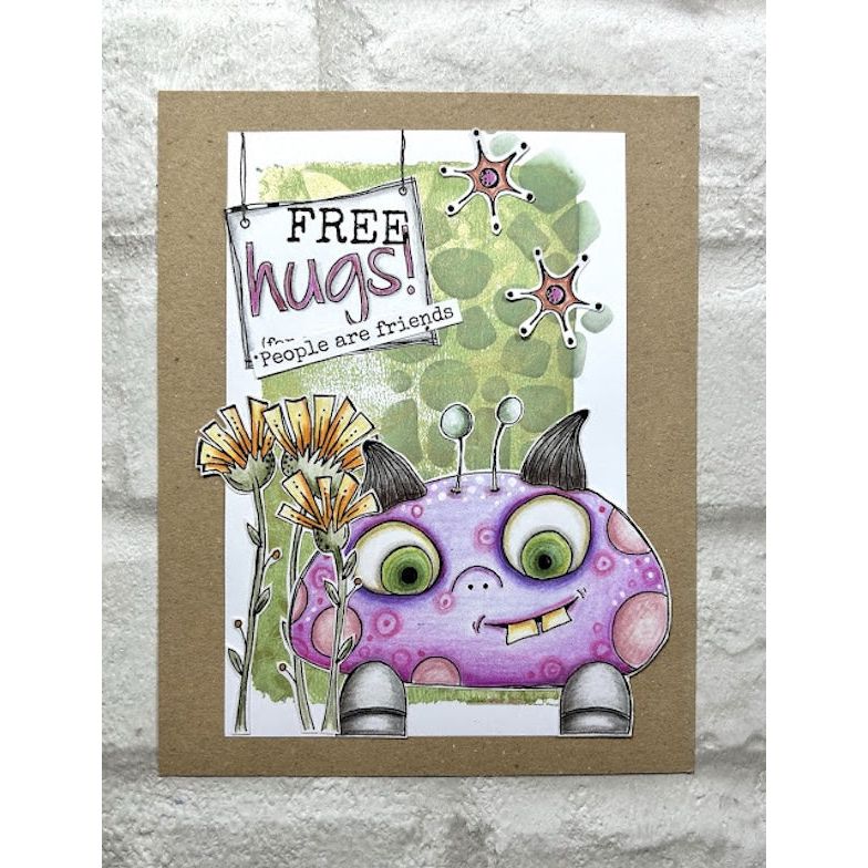 The Paper Artsy JoFY 141 Cling Stamps, designed by Jo Firth-Young, bring a whimsical and playful touch to your crafting projects. Crafted from deeply etched red rubber, these precision-trimmed and foam-mounted stamps ensure crisp, detailed impressions. This 6 x 8-inch cling stamp set includes nine designs, featuring three adorable monsters, a box labeled "Free Hugs for Everyone," the phrase "Monster Rule #001: People are friends, not food," and the words "Monsters," "Humans," "People," and "Friends." Perfect for adding a fun, quirky charm to your handmade cards, journals, and mixed-media creations.