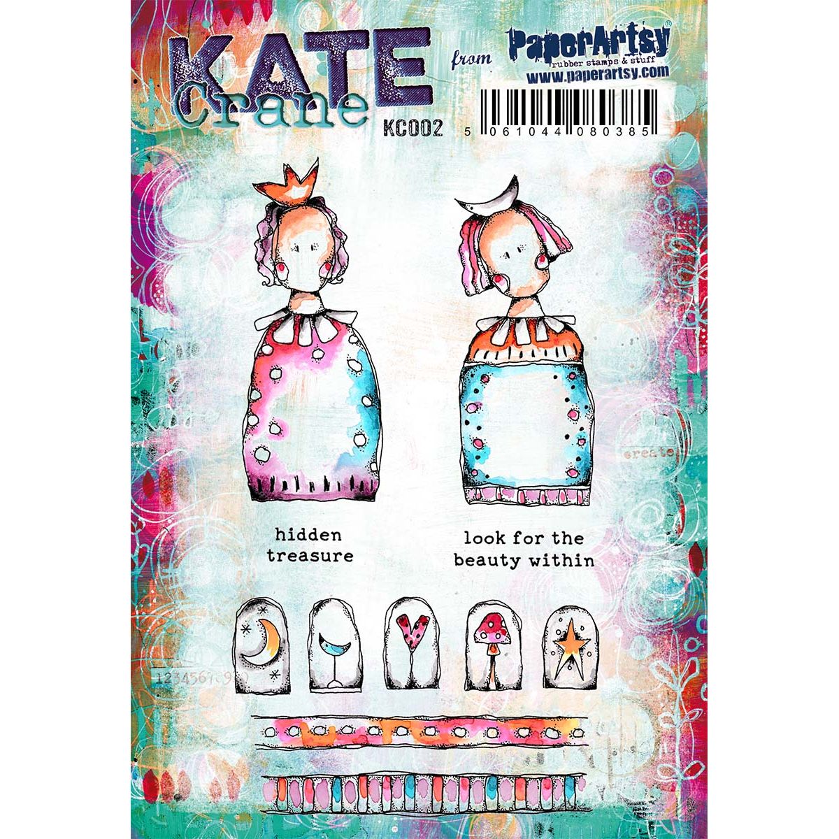 Paper Artsy Kate Crane Cling Stamps are multi-layered, loaded with explorative marks and easily identified by her whimsical elements. Crafted from deep-etched red rubber, these stamps are precision-trimmed and foam-mounted for ease of use. This delightful collection encompasses 7 cling stamps arranged on a 6 x 8-inch sheet. Designs feature two distinct forms, each with a woman’s head – one adorned with a regal crown and the other with a graceful crescent moon. Additionally, the set includes borders composed of lines and circles, along with 5 arches embellished with various symbols such as crescent moons, hearts, mushrooms, and stars. Among the sentiments are "hidden treasure" and "look for the beauty within."