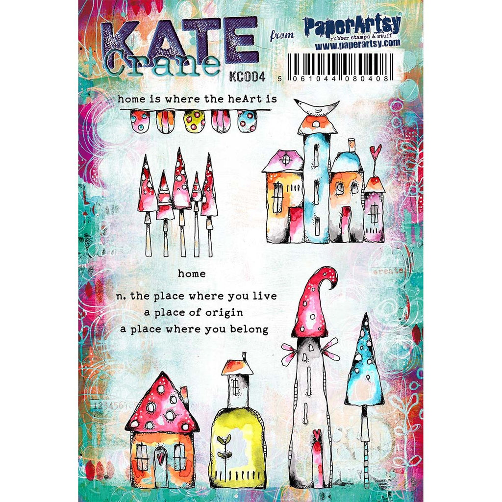 Paper Artsy Kate Crane Cling Stamps are multi-layered, loaded with explorative marks and easily identified by her whimsical elements. Crafted from deep-etched red rubber, these stamps are precision-trimmed and foam-mounted for ease of use. This collection comprises 8 cling stamps on a 6 x 8-inch sheet. Designs range from a charming banner adorned with polka dot and striped flags, featuring the phrase "home is where the heArt is," to a delightful cluster of 4 city townhomes complete with windows, doors, and a perched bird. Additionally, the set includes various quirky house shapes with unique designs, along with whimsical depictions of pointy trees and a single tree with a tall trunk. The collection is complemented by a definition of home: "The place where you live, a place of origin, a place where you belong."