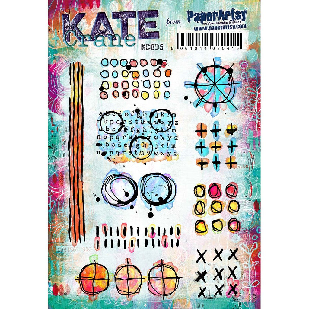 Paper Artsy Kate Crane Cling Stamps are multi-layered, loaded with explorative marks and easily identified by her whimsical elements. Crafted from deep-etched red rubber, these stamps are precision-trimmed and foam-mounted for ease of use. This collection features 10 cling stamps arranged on a 6 x 8-inch sheet. Designs range from a row of 4 squiggly lines to a group of segmented circles, offering a variety of creative possibilities. Additionally, the set includes a pair of drawn rings with splotches, repeating alphabet letters adorned with drips and rings, two different clusters of wonky tiny circles, as well as a group of plus signs and a group of Xes, each contributing to the playful and eclectic aesthetic of Kate's artistic style.