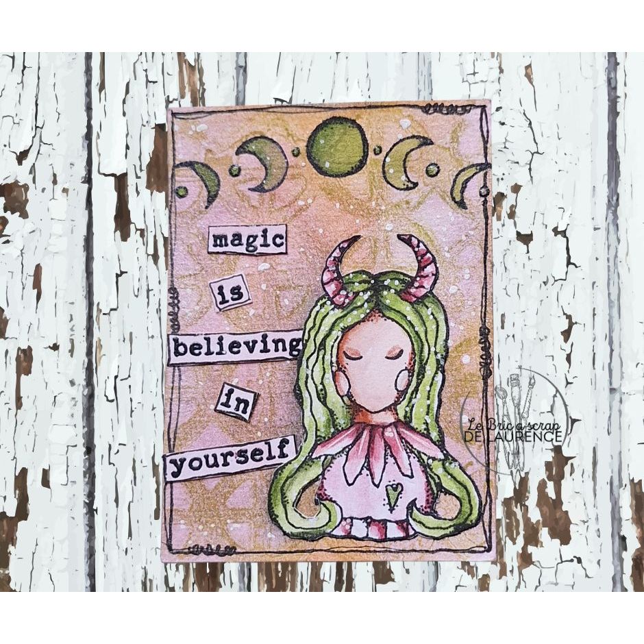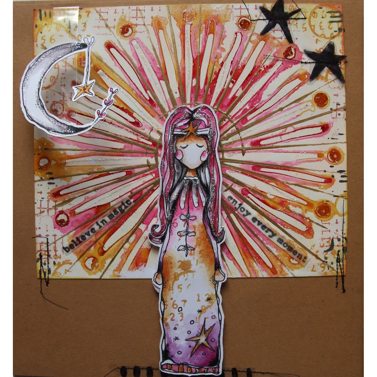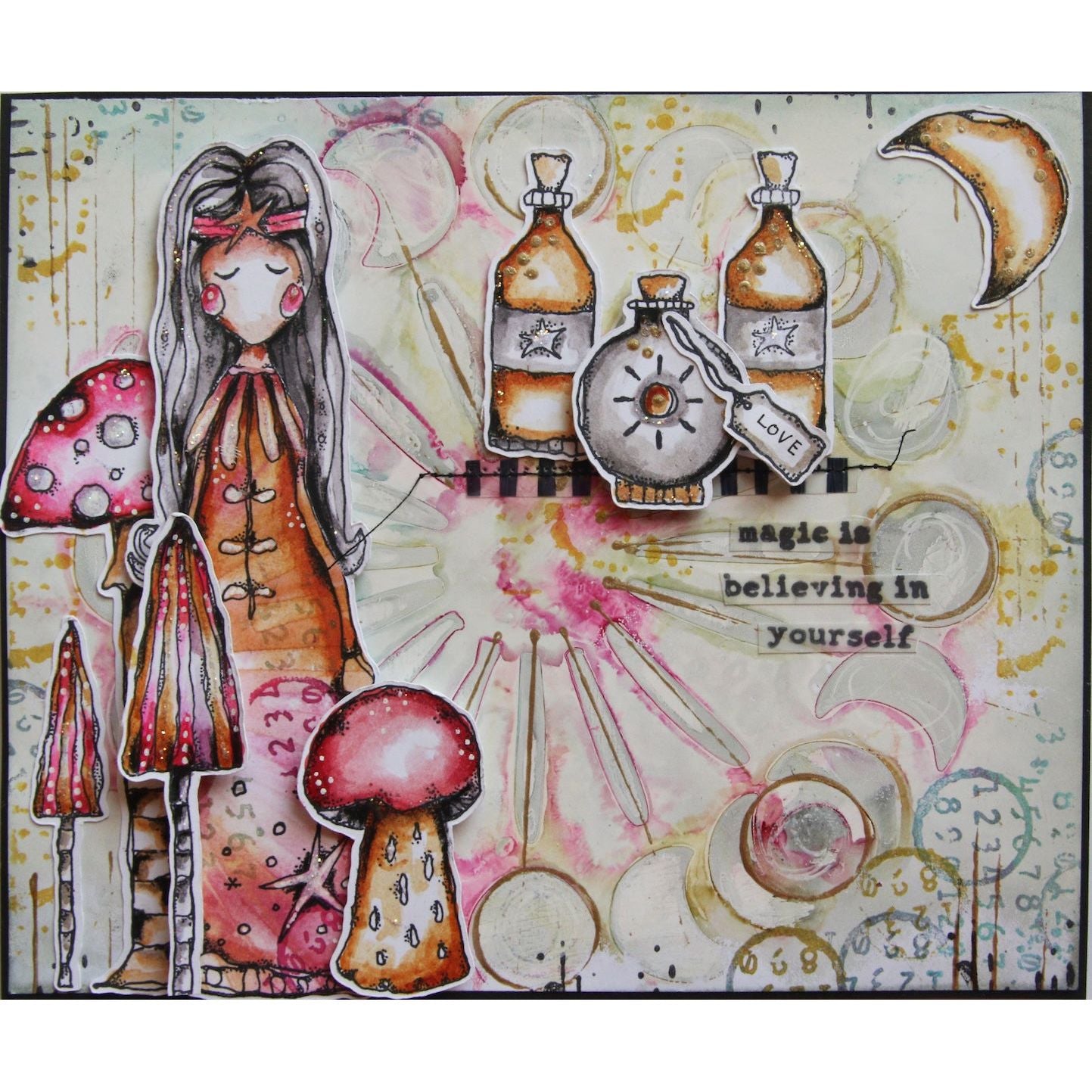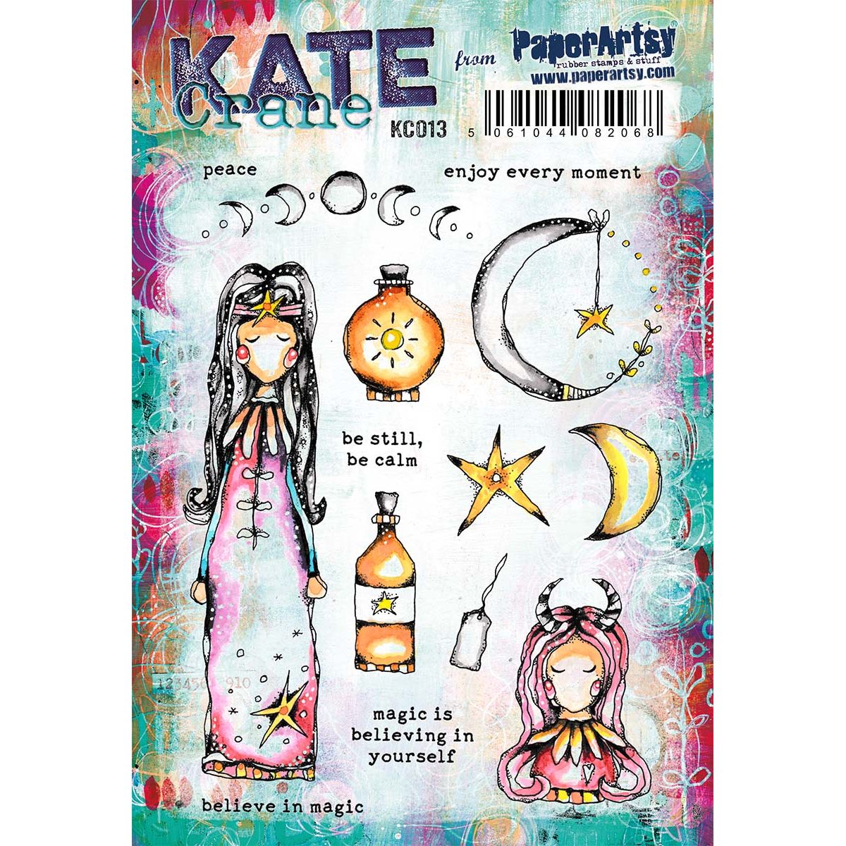 PaperArtsy Kate Crane Cling Stamps are whimsical and richly layered, perfect for adding playful, imaginative detail to your projects. Crafted from deep-etched red rubber, these stamps are precision-trimmed and foam-mounted for ease of use. This collection includes over 10 cling stamps on a 6 x 8-inch sheet, featuring phases of the moon, potion bottles, stars, crescent moons, a tag, and ethereal illustrations of mystical women. Sentiments include “enjoy every moment,” “be still, be calm,” “magic is believing in yourself,” “believe in magic,” and “peace.”