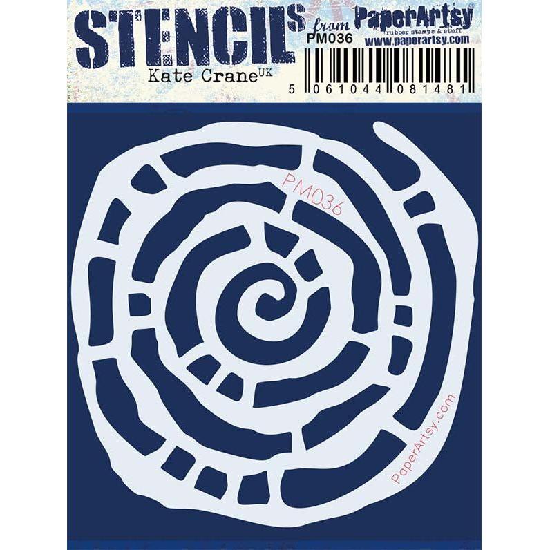 The Paper Artsy Mini Stencil, measuring approximately 3.5 x 3.75 inches, is ideal for use with small format gel plates to explore a wide variety of mono-he Paper Artsy Mini Stencil, measuring approximately 3.5 x 3.75 inches, is perfect for small format gel plates and ideal for exploring a wide variety of mono-printing techniques with paint, dye sprays, and more. This versatile stencil is compatible with mediums like paint, Grunge Paste, sprays, crayons, pastels, pens, and chalks, making it suitable for use on paper, canvas, chipboard, and many other surfaces. The design features a spiral with segmented spaces in between, creating dynamic backgrounds and textured effects in your artwork.