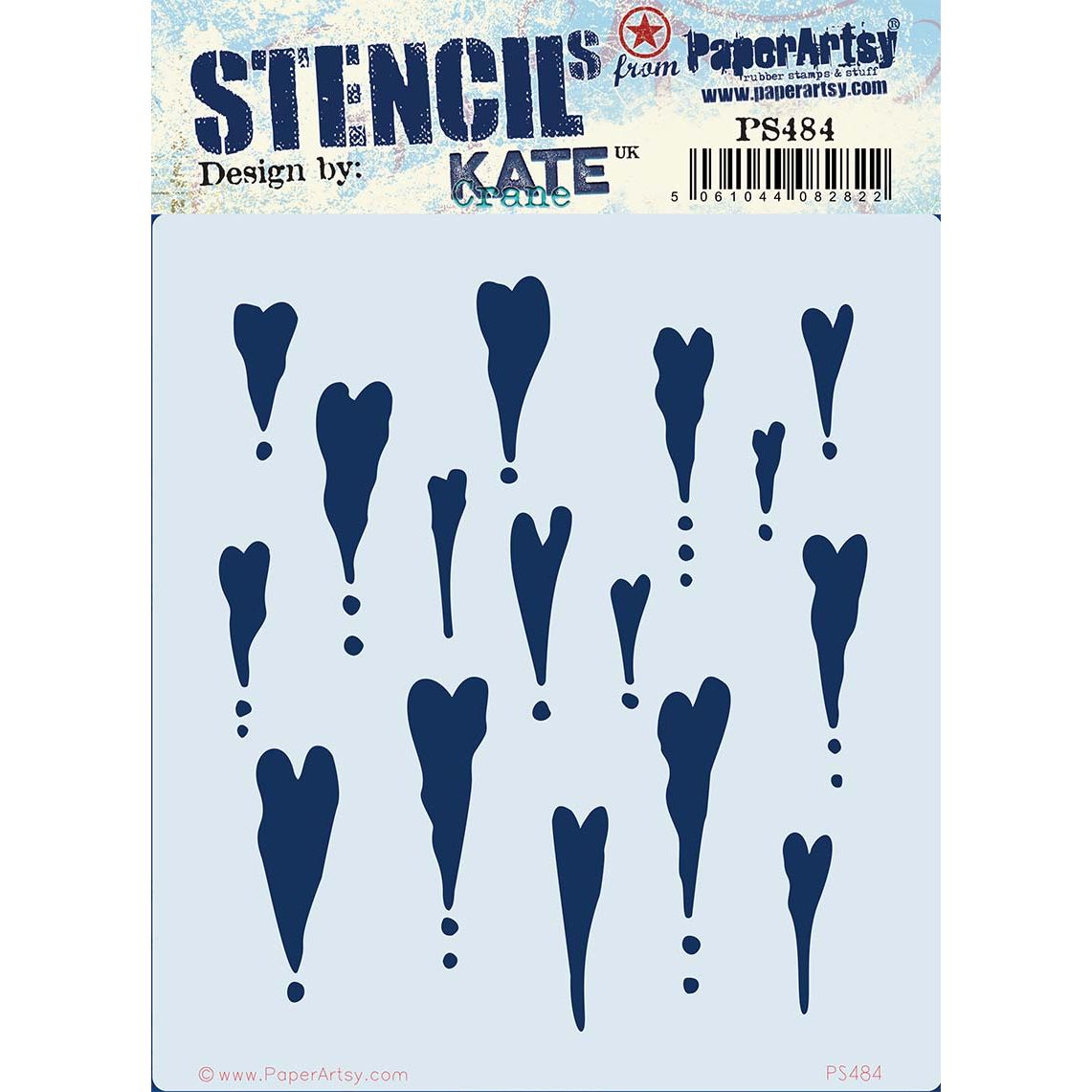 Paper Artsy Stencils are versatile tools suitable for use with a variety of mediums, including paints, pastes, sprays, crayons, pastels, pens, and chalks. This stencil works beautifully on surfaces such as paper, canvas, chipboard, and more. This stencil by Kate Crane measures approximately 6.5 x 7 inches and features a playful design of elongated hearts with dots at the bottom, creating a whimsical drip effect. Perfect for adding bold patterns, texture, and layered interest to your creative projects.