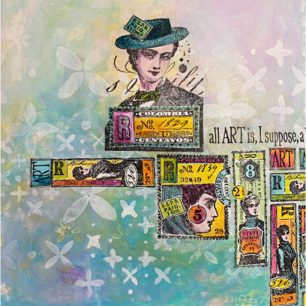 The Paper Artsy Lynne Perrella 64 Cling Stamps, designed by Lynne Perrella, epitomize her iconic design style. Deeply etched red rubber, each stamp individually trimmed and foam mounted. This collection comprises 6 cling stamps on a 6 x 8-inch sheet. Within this collection, you'll find captivating designs, including a Victorian English woman adorned with collages of purses, keys, watches, and a London building within her dress. There are also two busts of vintage women, one wearing a hat and a necklace adorned with numerous charms, and the other donning a hat with the phrase "USPS Paid" and a bill across her chest. Additionally, the set includes a rectangular postage stamp, the word "Art," and the thought-provoking phrase, "all art is, I suppose, a kind of exploring."