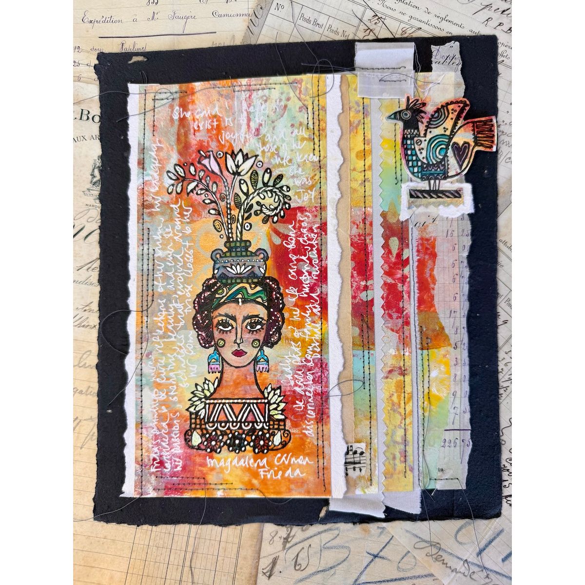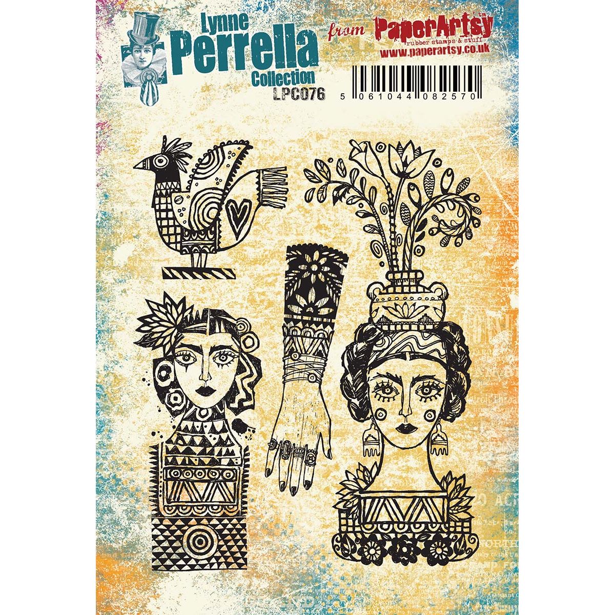 The PaperArtsy Lynne Perrella Cling Stamps are crafted from deeply etched red rubber, carefully trimmed and foam-mounted for precision stamping. This set features 4 detailed cling stamps arranged on a 6 x 8-inch sheet showcasing Lynn’s signature intricate style. The designs include Frida Kahlo-inspired portraits featuring two busts of women adorned with Aztec-inspired geometric dress patterns, flowers in their styled hair, and striking details such as a vase of flowers balanced on one head, expressive made-up eyes, and an arm decorated with rings on every finger. Completing the set is a whimsical bird design filled with playful shapes and a heart motif. Perfect for mixed media, art journaling, and unique statement projects, this set combines bold artistry with ornate detail.