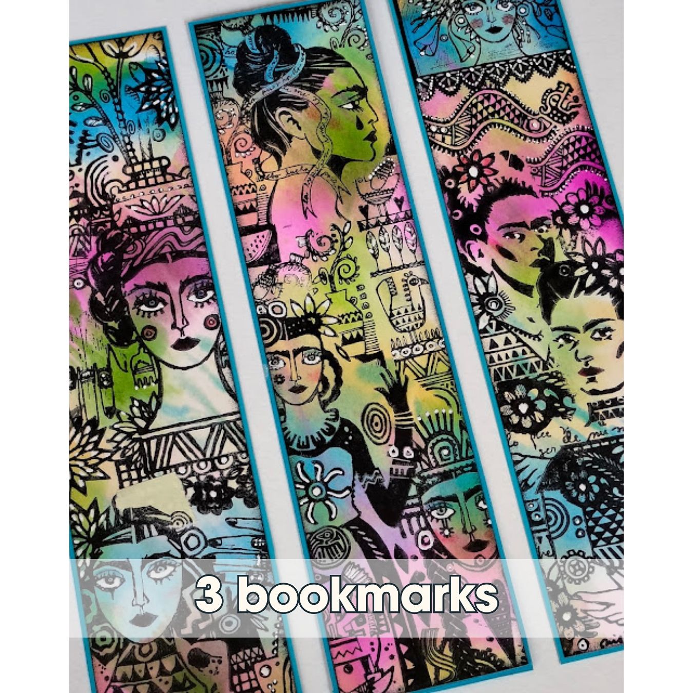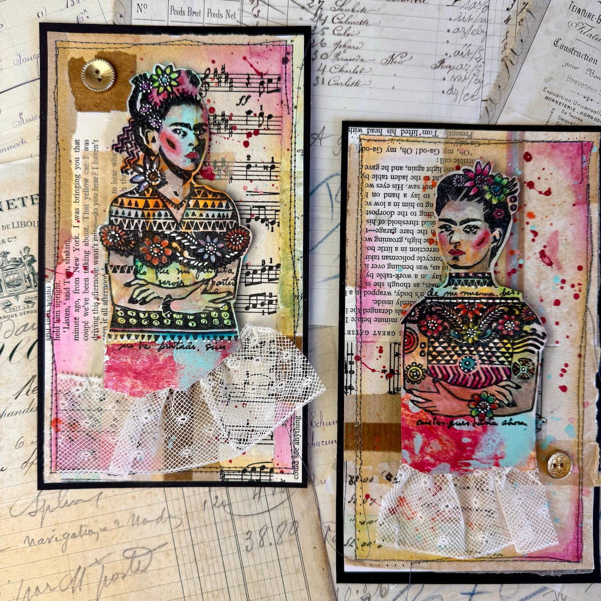 The PaperArtsy Lynne Perrella Cling Stamps are crafted from deeply etched red rubber, carefully trimmed and foam-mounted for precision stamping. This set features 5 detailed cling stamps arranged on a 6 x 8-inch sheet showcasing Lynn’s signature intricate style. The designs feature two unique depictions of Frida Kahlo, both shown with geometric tops, flowers in their hair, and arms crossed. Additional images include a rectangular portrait, along with Aztec-inspired drawings of a bird and a snake filled with intricate shapes and patterns. Perfect for mixed media, art journaling, and expressive cardmaking, this set captures bold artistry with striking detail.