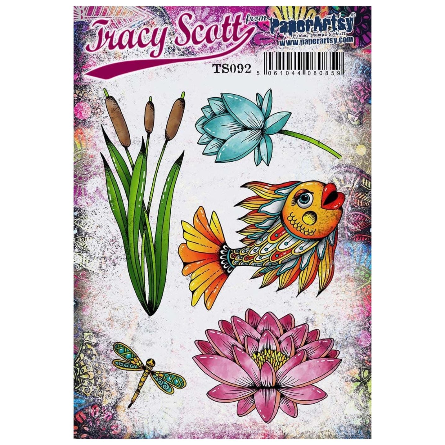 The Paper Artsy Tracy Scott Cling Stamps showcase a delightful collection that embodies Tracy's bright and cheerful style, featuring playful doodles and bold imagery. These versatile stamps are perfect for journaling, card making, scrapbooking, and various altered or mixed-media art projects. This set includes 5 cling stamps arranged on a 6x8-inch sheet, featuring designs such as an ornate fish with flowing fins, eyelashes, and big lips, cat o' nine tails, lotus flowers, and a dragonfly.