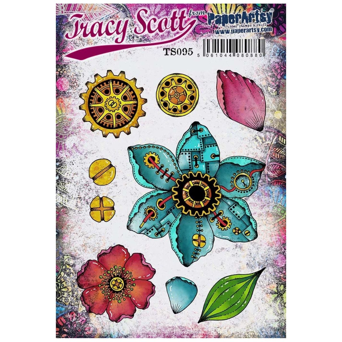 The Paper Artsy Tracy Scott Cling Stamps showcase a delightful collection that reflects Tracy's bright and cheerful style, characterized by whimsical doodles and bold imagery. These versatile stamps are perfect for journaling, card making, scrapbooking, and various mixed-media art projects. This set includes 9 cling stamps arranged on a 6x8-inch sheet, featuring designs such as a large bloom with mechanical parts on the petals, gears and cogs, leaves, additional petals and flowers, and two screw heads.