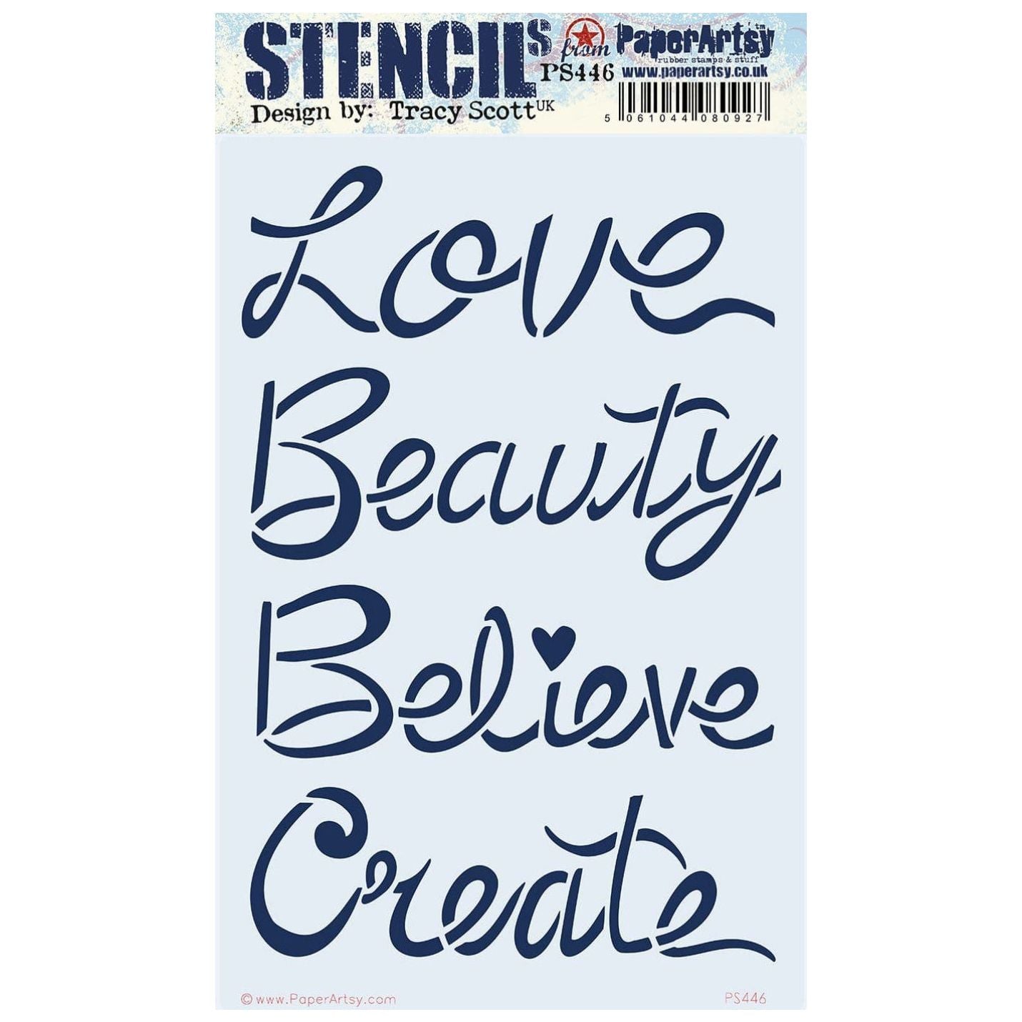 Designed by Tracy Scott, this versatile stencil provides a canvas for boundless creativity. Compatible with a variety of mediums including paint, Grunge Paste, paint sprays, crayons, pastels, pens, and chalks, it works beautifully on surfaces like paper, canvas, and chipboard. Crafted from high-quality, durable plastic, the stencil measures approximately 6.5 x 9.5 inches and features the words "Love," "Beauty," "Believe," and "Create" in a stylish scripted font.
