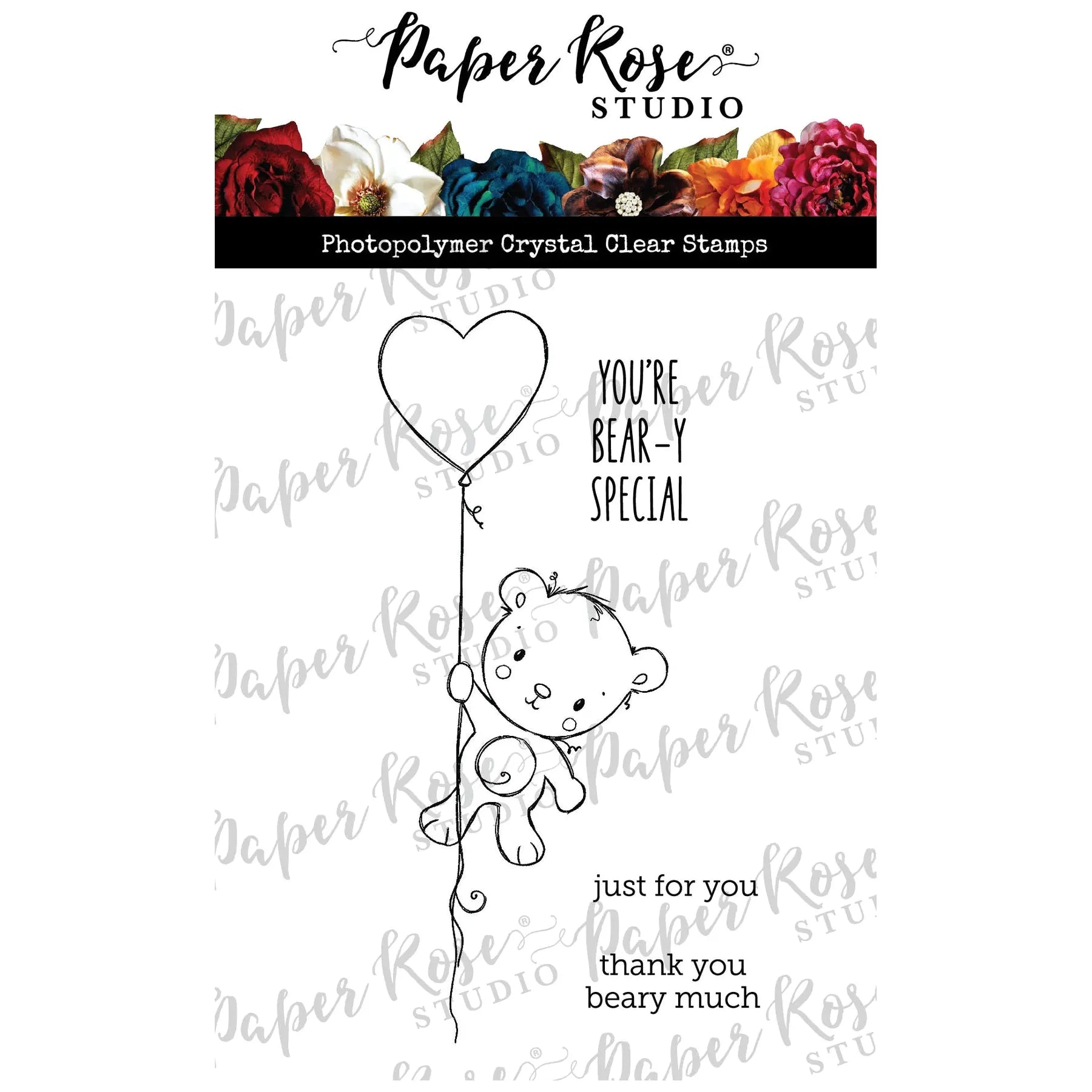 Paper Rose Bear Clear Stamps add a heartwarming touch to your crafting endeavors! This set, sized at 5 x 3 inches, comprises 4 clear, photopolymer stamps. Delight in endearing designs featuring an adorable teddy bear being lifted into the air while clutching a heart-shaped balloon. Sentiments include You’re bear-y special, just for you, and thank you beary much.