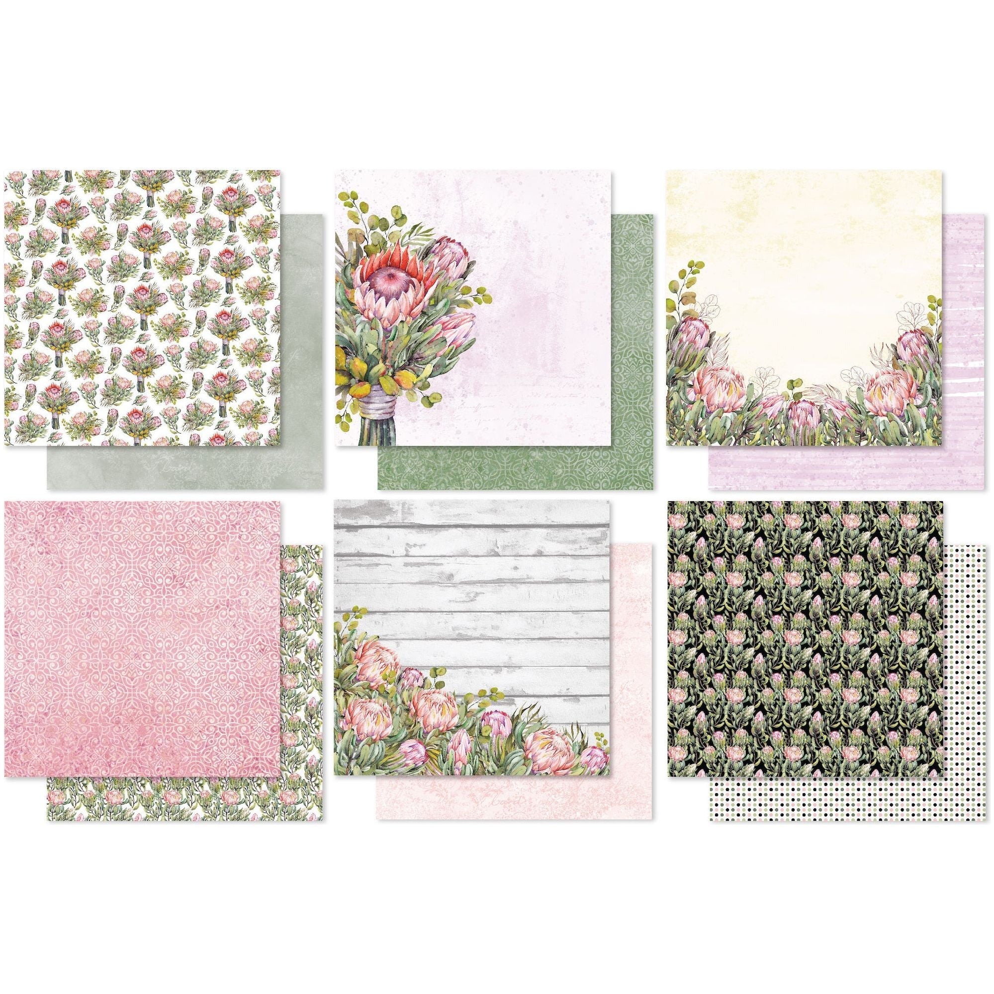 The Paper Rose Blooming Proteas 12x12 Paper is a collection that adds an elegant touch to your creative projects. Included are 12 double-sided patterned papers, with two sheets of the 12 unique designs. Approximately 12 x 12 inches, this cardstock boasts a sturdy weight of 200gsm. Immerse yourself in the beauty of these sheets, adorned with enchanting floral motifs, white-washed wood slats, delicate bouquets, playful polka dots, intricate pink mandalas, and graceful eucalyptus leaves.
