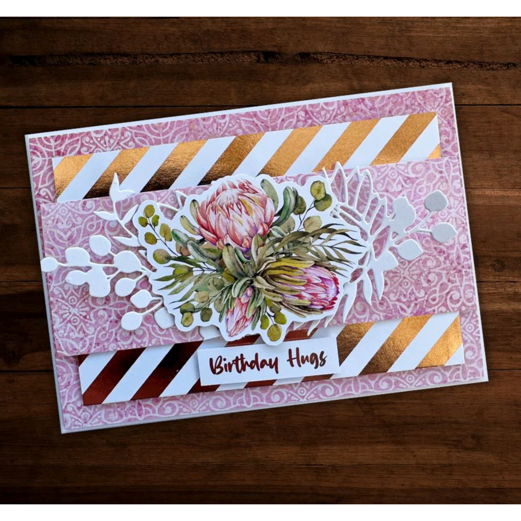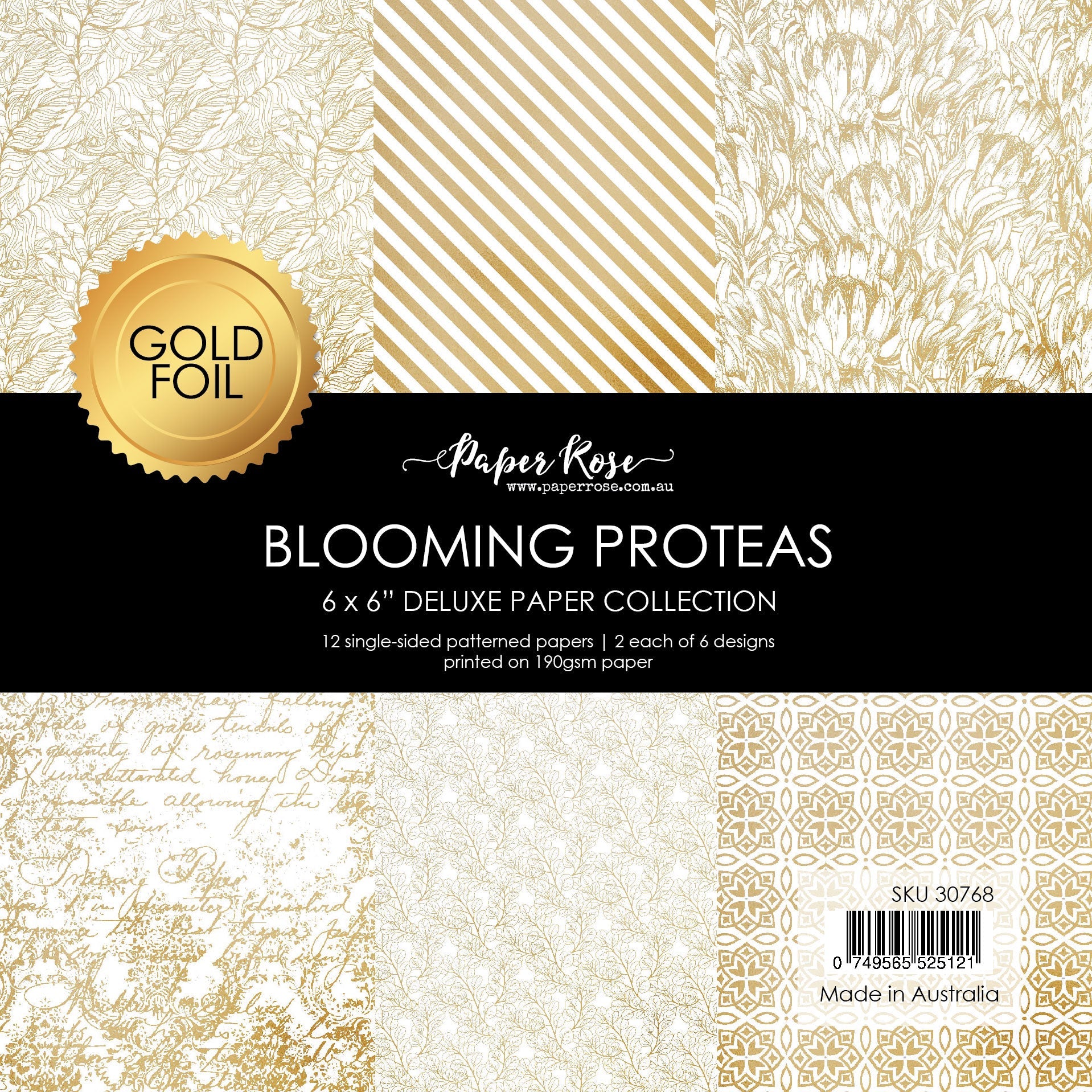 The Paper Rose Blooming Proteas Gold Foil 6x6 Paper is a collection designed to enrich your creative projects. Included are 12 single-sided foiled pattern papers, showcasing 2 of each distinctive design. These sheets measure approximately 6 x 6 inches and possess a durable 190gsm weight. The metallic cardstock exudes elegance, featuring intricate mandalas, graceful leaves, delicate fronds, distressed damask prints with writing, captivating diagonal stripes, and charming florals. Embrace the versatility of this exquisite collection to infuse an additional touch of sophistication into your crafting endeavors.
