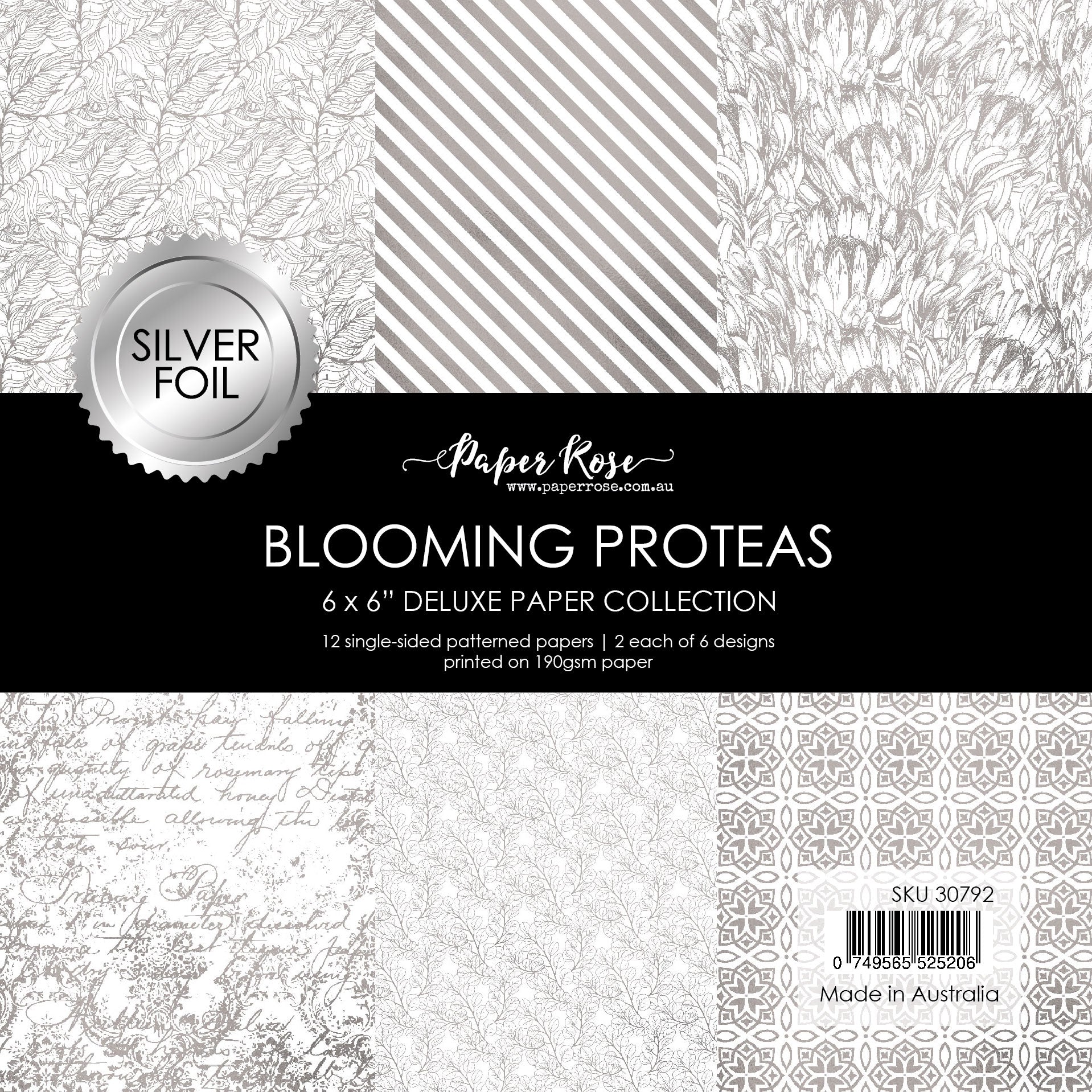 The Paper Rose Blooming Proteas Silver Foil 6x6 Paper is a collection designed to enrich your creative projects. Included are 12 single-sided foiled pattern papers, showcasing 2 of each distinctive design. These sheets measure approximately 6 x 6 inches and possess a durable 190gsm weight. The metallic cardstock exudes elegance, featuring intricate mandalas, graceful leaves, delicate fronds, distressed damask prints with writing, captivating diagonal stripes, and charming florals. Embrace the versatility of this exquisite collection to infuse an additional touch of sophistication into your crafting endeavors.